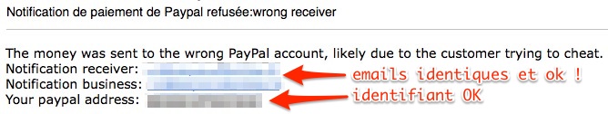 L'adresse email et l'identifiant PayPal sont bien ok. L'adresse email pour le "receiver" et le "business" sont les mêmes.