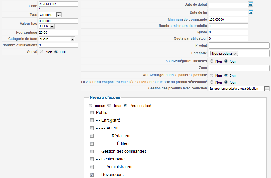 Notez par ailleurs, que le critères minimum 100 Euros de commande ne s'exprime que sur le HT donc, si dans votre esprit le but était de se déclencher à 100 Euros TTC, il va falloir revoir le montant minimum dans la configuration du coupon.