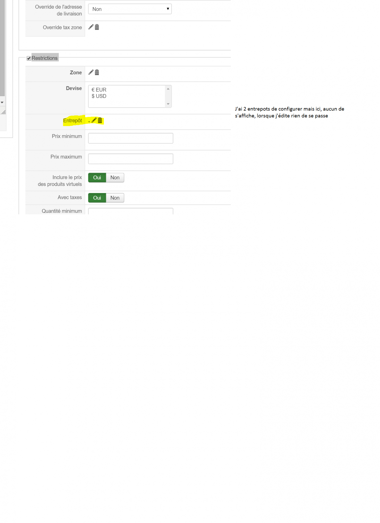 J'ai testé la solution de mettre mes produits dans 2 entrepots (est ce qu'il y aune autre methode plus facile ?!). Puis faire des methodes de livraison avec restriction sur les entrepots. Mais à ce moment, impossible d'editer la ligne restriction entrepot pour en choisir un !