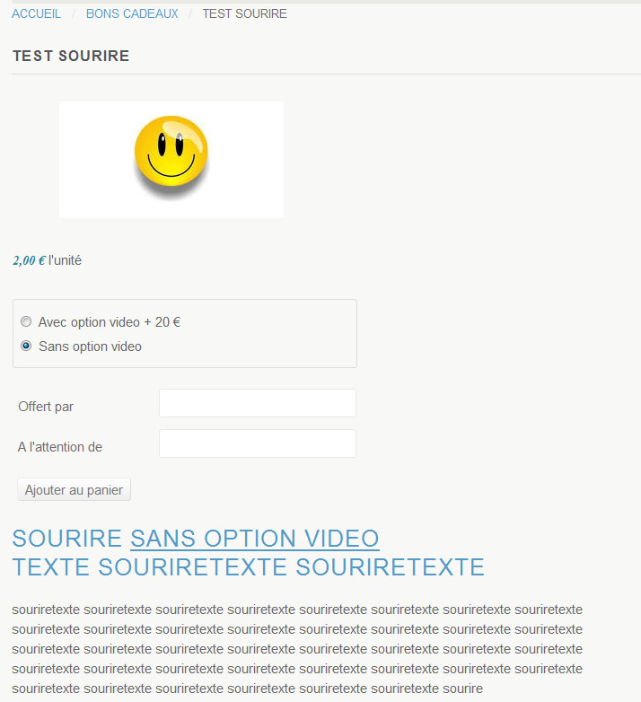 1/ Sur mes pages produits (un seul produit) (ici test sourire), je n'arrive pas à positionner les infos caractéristiques et ajout au panier etc.. à coté de l'image comme ici