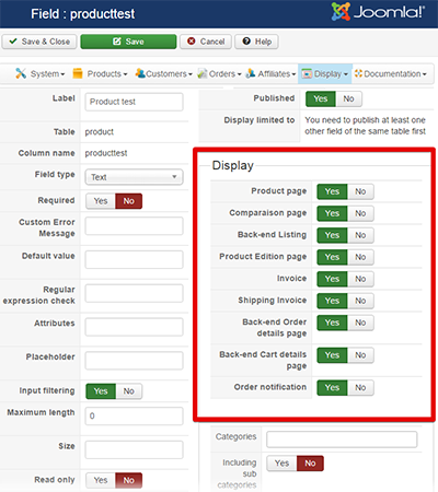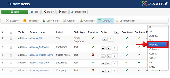 Par ici: Components => HikaShop => Configuration, puis aller sur le Display => Custom fields, puis dans le dropdown Custom fields type, sélectionnez Products (voir screenshot)