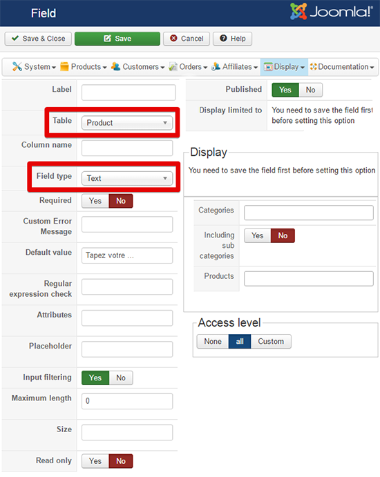- Définissez les champs requis et plus spécialement la Table sur "Product" et si j'ai bien compris votre besoin le Field type sur "Text".