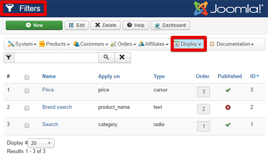 Ensuite sachez que vous devez publier le module filtre d'HikaShop (HikaShop Filter Module) qui ajoutera automatiquement les différents filtres que vous avez crés.