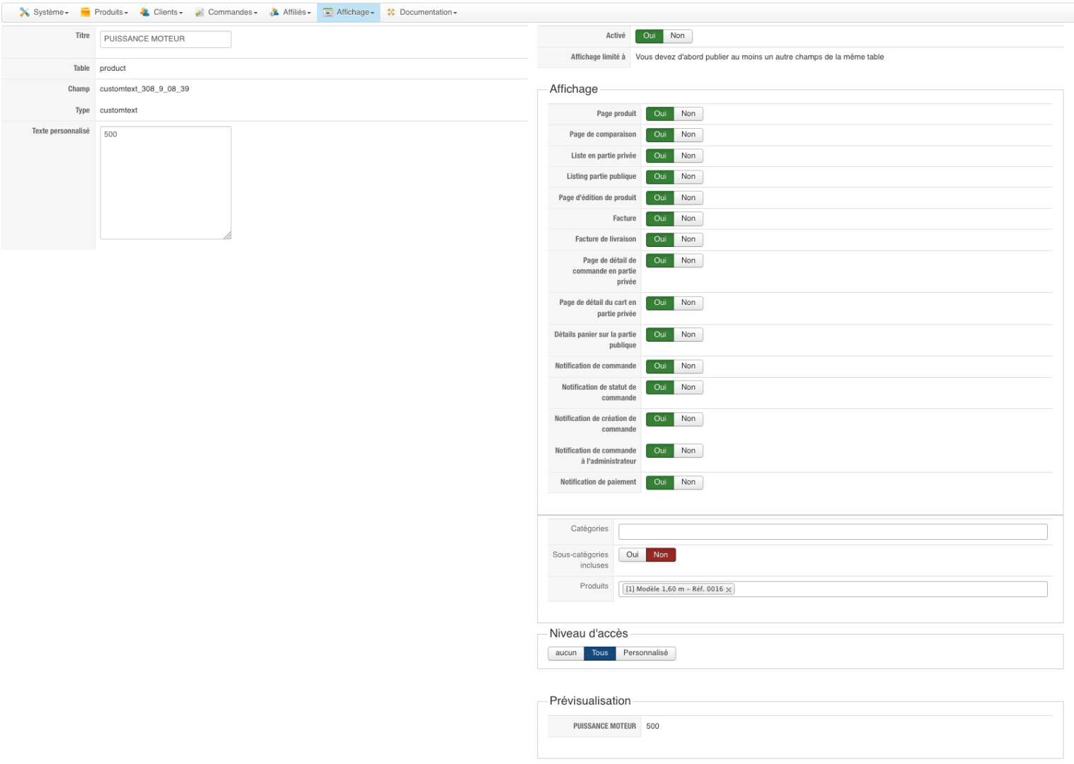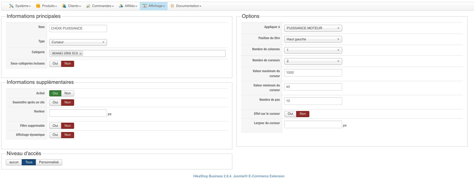 Mais si vous parlez de la puissance moteur d'un moteur, je suppose que c'est une donnée que vous donnez à l'utilisateur sur la page produit, et non quelque chose que vous voulez qu'il sélectionne. Il faut donc que vous créez un champs personnalisé de la table "produit" et vous arrivez à faire ce que vous voulez avec un filtre sur ce champs.