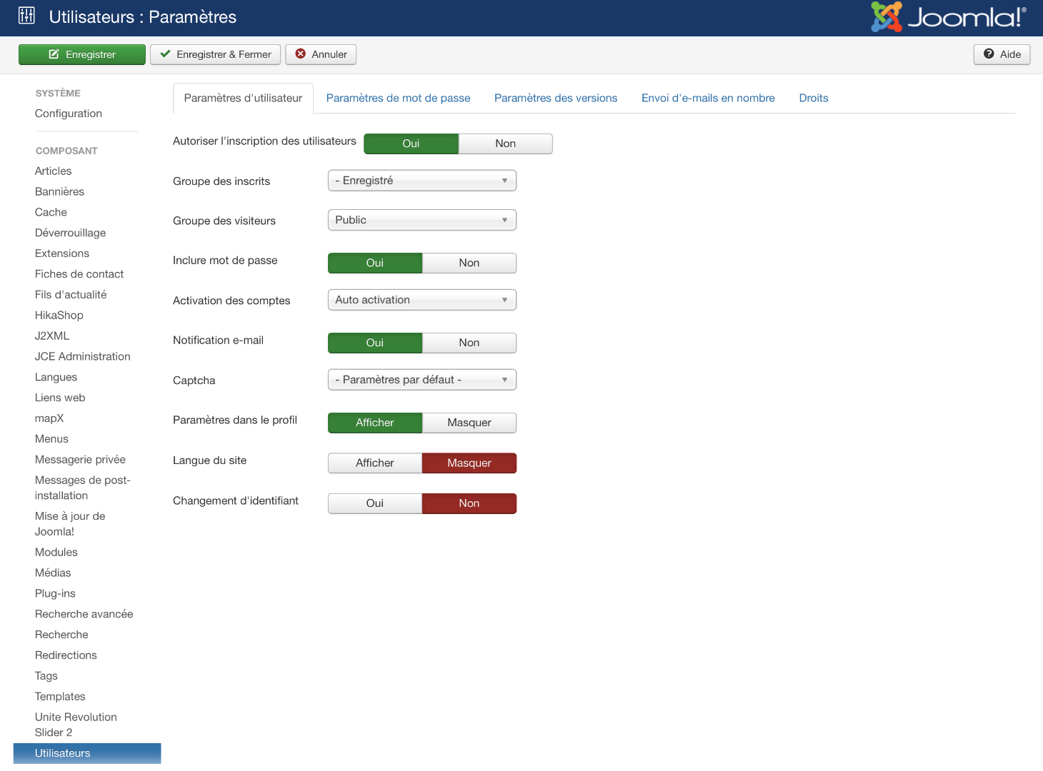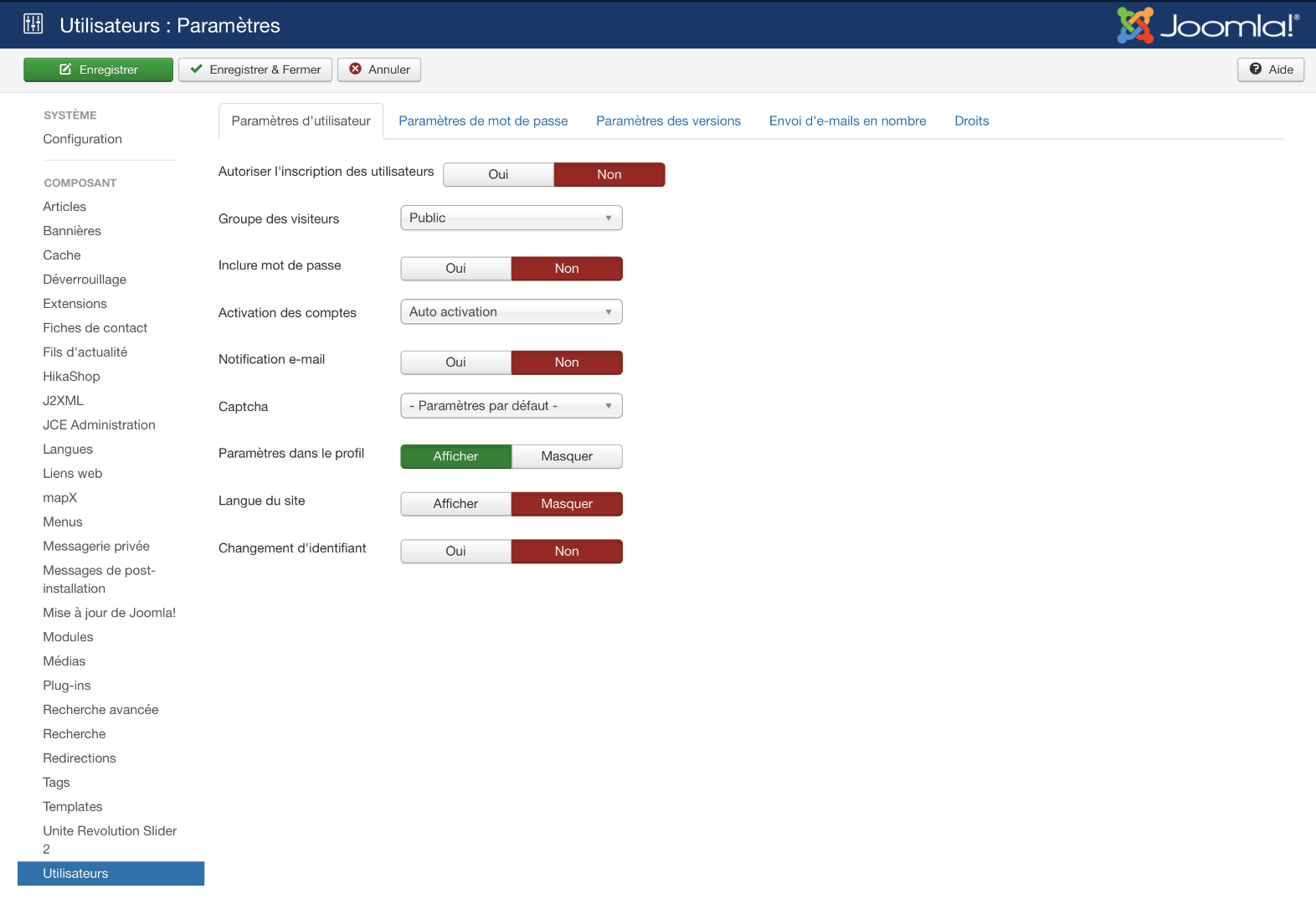 Suite à des inscriptions d’utilisateurs qui me semble suspect, j’aimerai changer les paramètres utilisateurs de Joomla pour interdire l'inscription des utilisateurs.