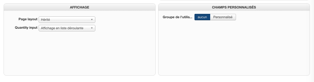 Pour votre deuxième soucis, merci de fournir des captures de la configuration produit afin que nous puissions reproduire votre configuration sur un site local.