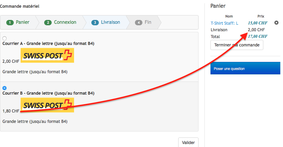 Pour rappel, le problème que je rencontre lorsque le legacy-checkout est activé est que les frais de livraison restent à zéro, malgré qu'une mode d'envoi payante ait été sélectionnée par l'internaute. Lorsque je désactive le legacy-checkout, il est impossible d'aller au-delà de l'étape "mode de livraison"; l'utilisateur peut sélectionner le mode de son choix, mais impossible de passer à l'étape suivante.