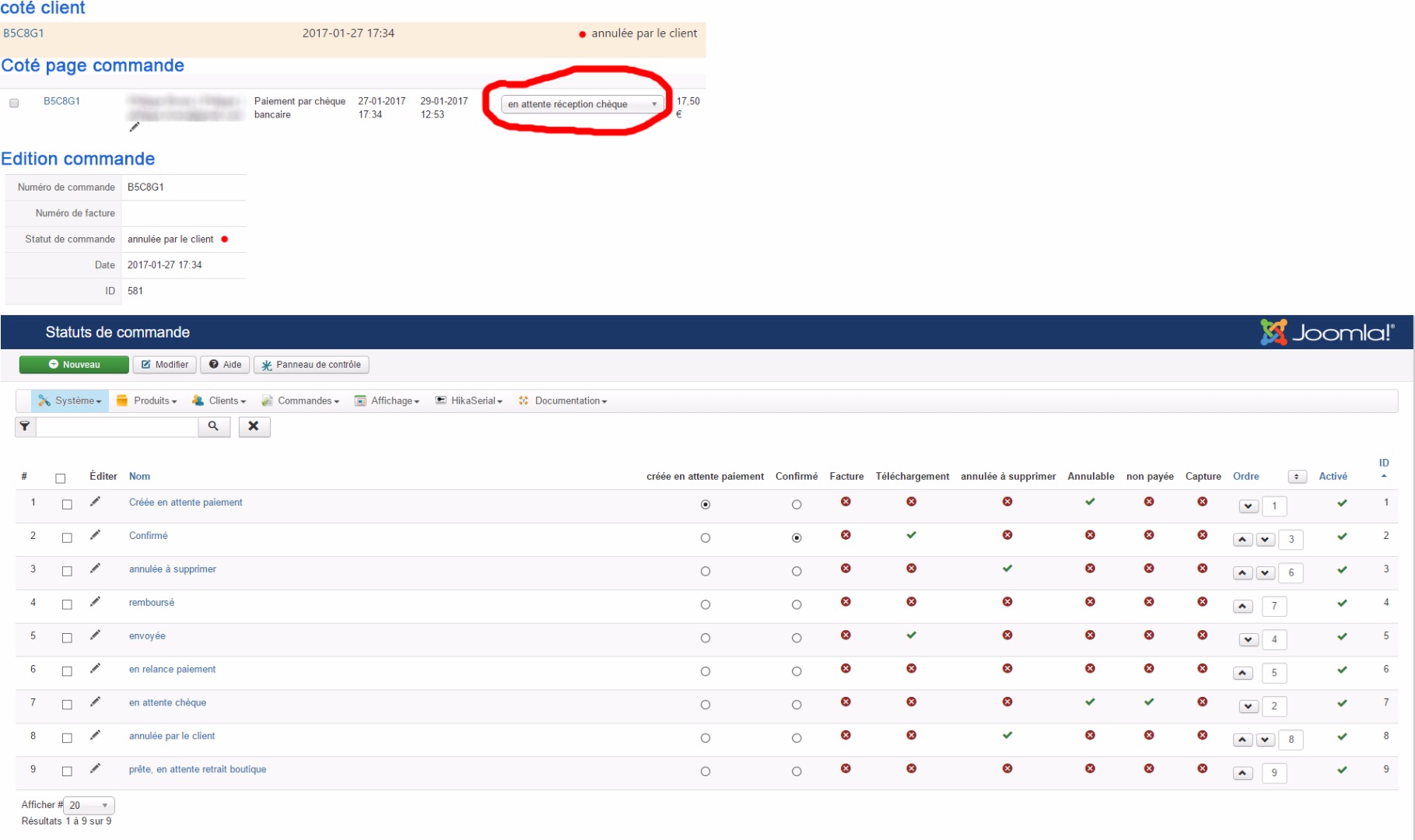 Bonjour , effectivement le statut d'attente est bien "en attente réception chèque" , lorsqu'on annule le statut devient "créée en attente paiement" (created), j'ai supprimé ma surcharge de traduction pour me simplifier la recherche mais cela ne change rien ....donc je l'ai remise.