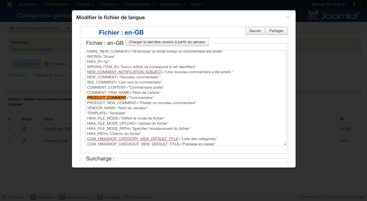 PS : Je vous déconseille fortement de poster tout votre fichier de langue sur notre forum. Par contre vous avez des outils dans Joomla (et donc, relatif à Joomla) pour faire du "debug" de la traduction.