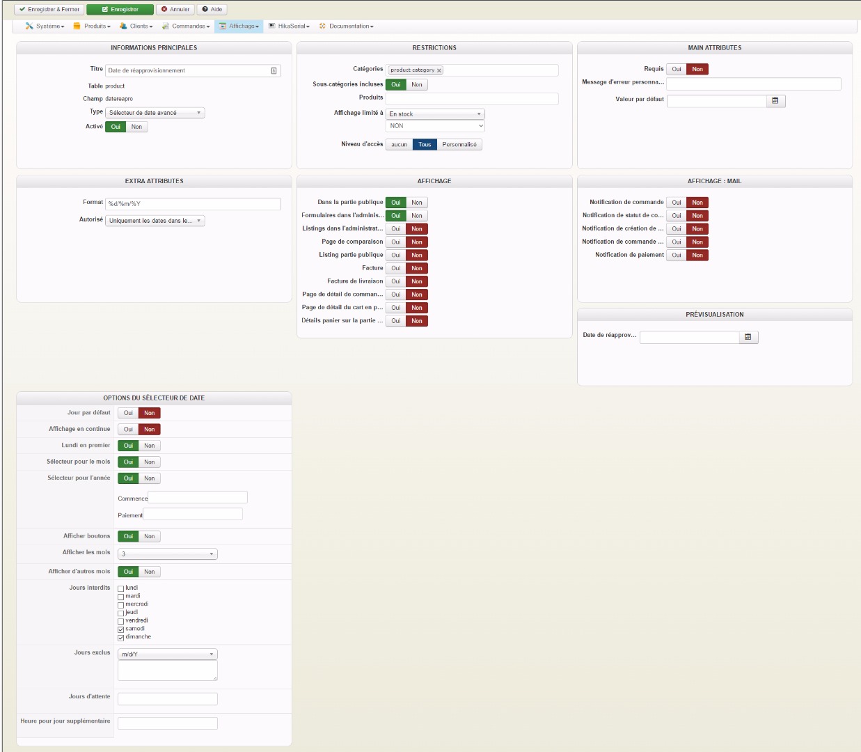 Bonjour, j'ai créé un champ personnalisé dans les produits pour afficher une date de réapprovisionnement avec le sélecteur de date avancé.