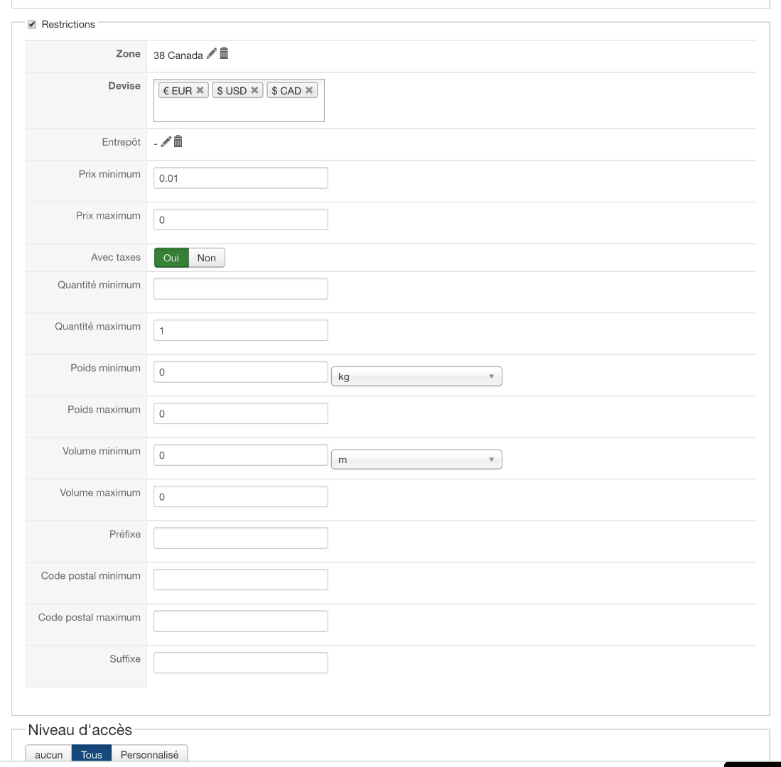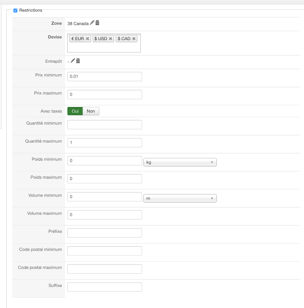 Dans la configuration de la livraison, j'ai mis Prix minimum 0.01 et le maximum se met tout seul à zéro