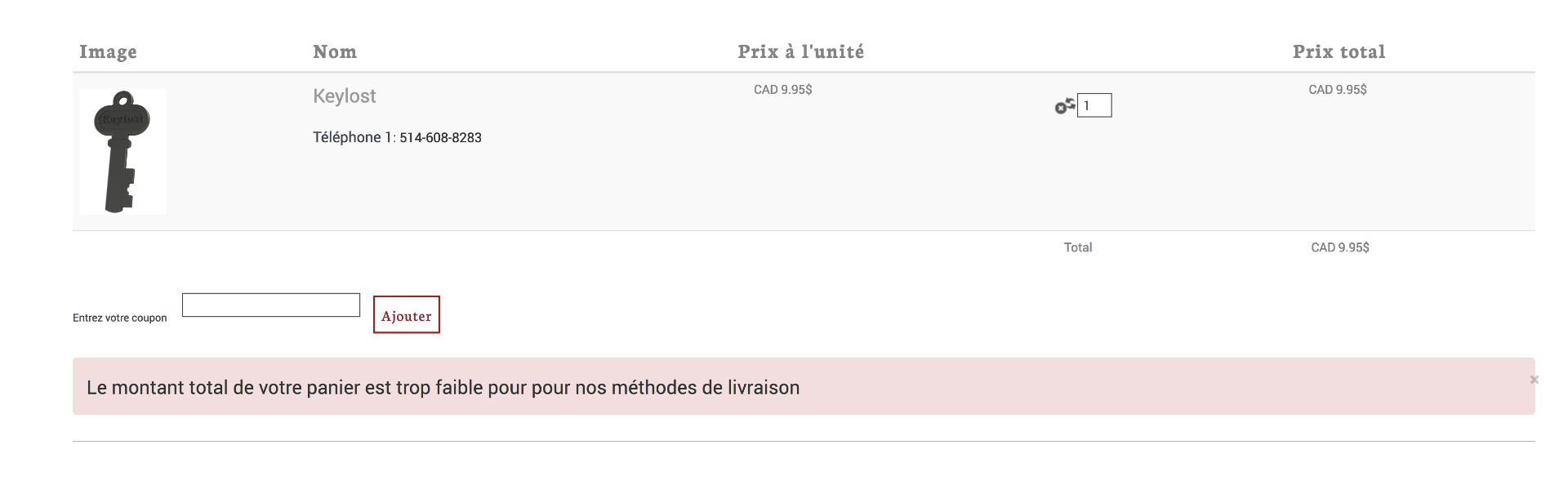De plus, j'obtiens un message "Le montant total de votre panier est trop faible pour nos méthode de livraison" ( seulement dans Firefox)