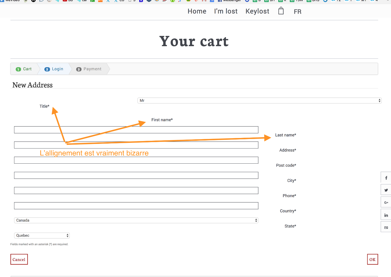 Dans la page du passage à la caisse, une fois connecté. Nous avons l'option d'jouter une nouvelle adresse. Lorsqu'on clic sur "Nouveau", la page où on est redirigé pour entrer une nouvelle adresse a un problème d'affichage. Les Labels sont à droite et désalignés. Je crois qu'il devrait être à gauche des FIelds.
