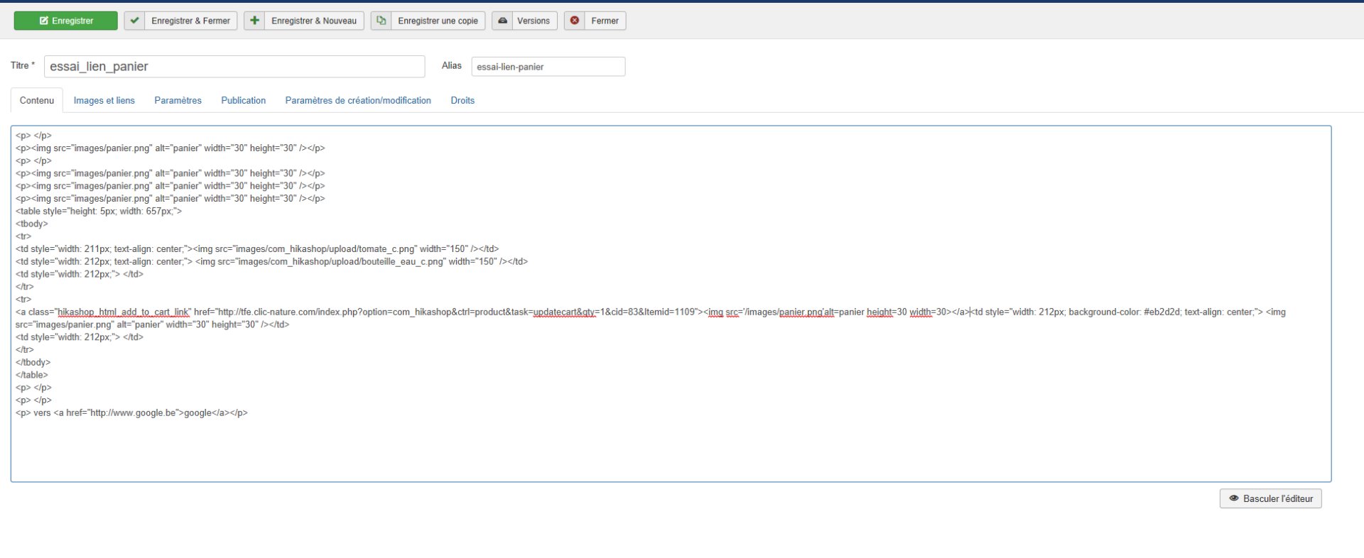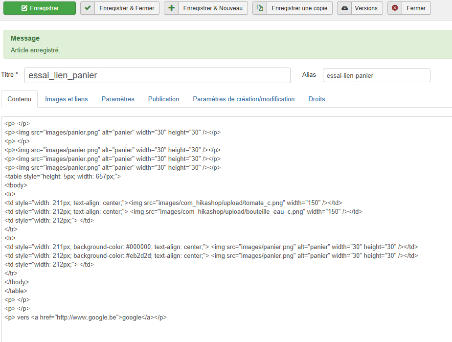 Vous nous avez fourni une capture de l'édition de l'article après avoir appuyé sur "sauver". Serait-il possible d'avoir une capture juste avant d'appuyer sur sauver pour vérifier que vous ajoutez le bon code au bon endroit dans l'article ?