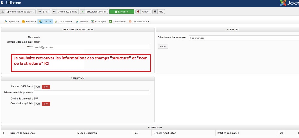 Mais comment récupérer les informations des champs personnalisés "structure" et "nom de la strucure" dans la fiche client de hikashop?