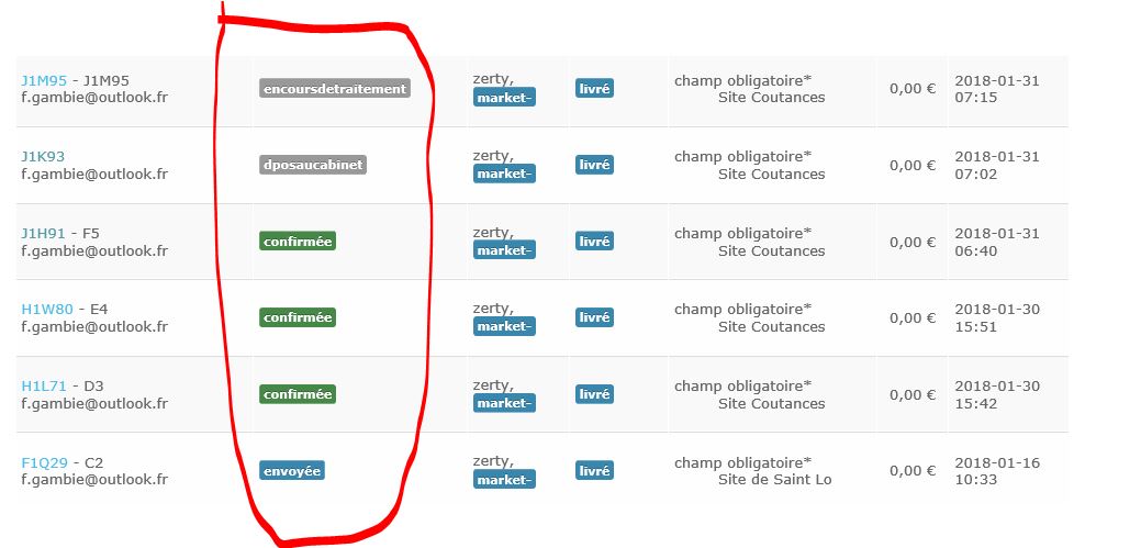 Je souhaiterais avoir "créée" en bleu, "en cours de traitement" en gris, "déposé en pharmacie" et "déposé au cabinet" en vert, et annulée en "rouge".