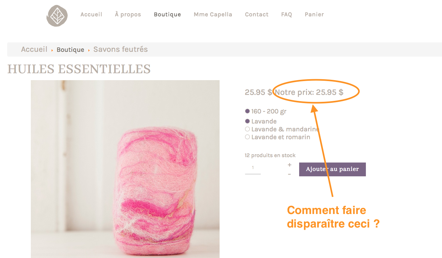 Le prix affiché des produit est correct pour tous les produits sauf pour ceux dans la catégorie Savons feutrés qui affiche la mention « Notre prix: » et une deuxième fois le prix.