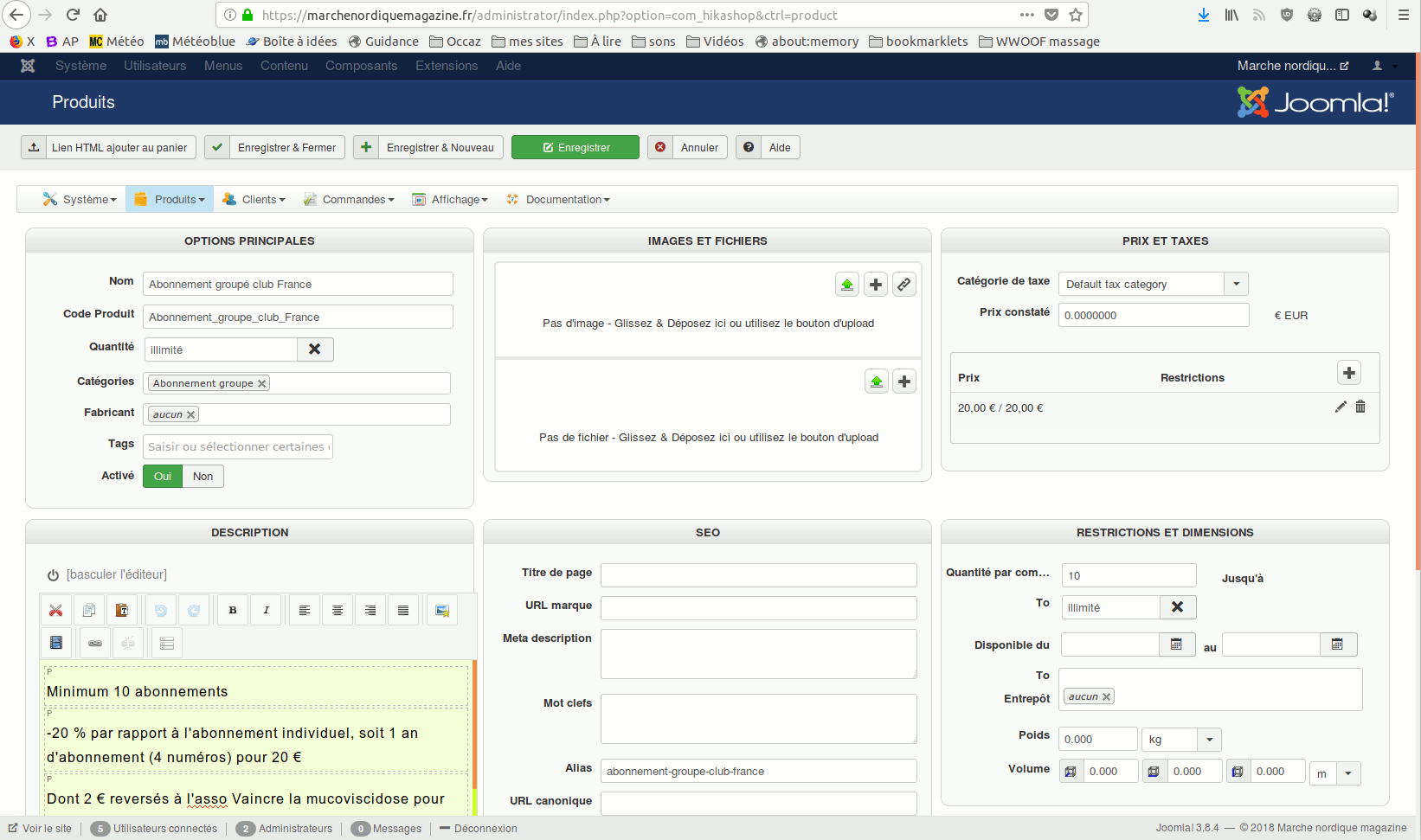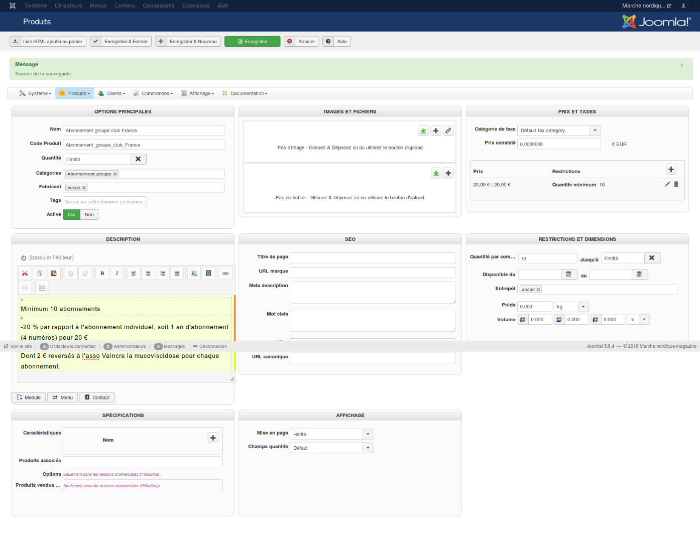 Voici une capture complète. Par rapport à la précédente, j'ai remis le critère « quantité minimum 10 » dans la zone « prix et taxes » car je souhaite que sur la partie publique s'affiche « 20,00 € l'unité pour au moins 10 achetés. » (Avec ou sans ce critère, le message d'erreur est le même.)