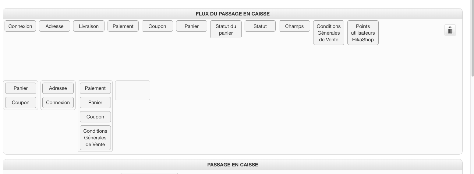 Pouvez vous nous fournir quelques captures d'écran de la manière dont vous avez configuré votre flux de passage ne caisse via "Hikashop->System->Configuration->Checkout".