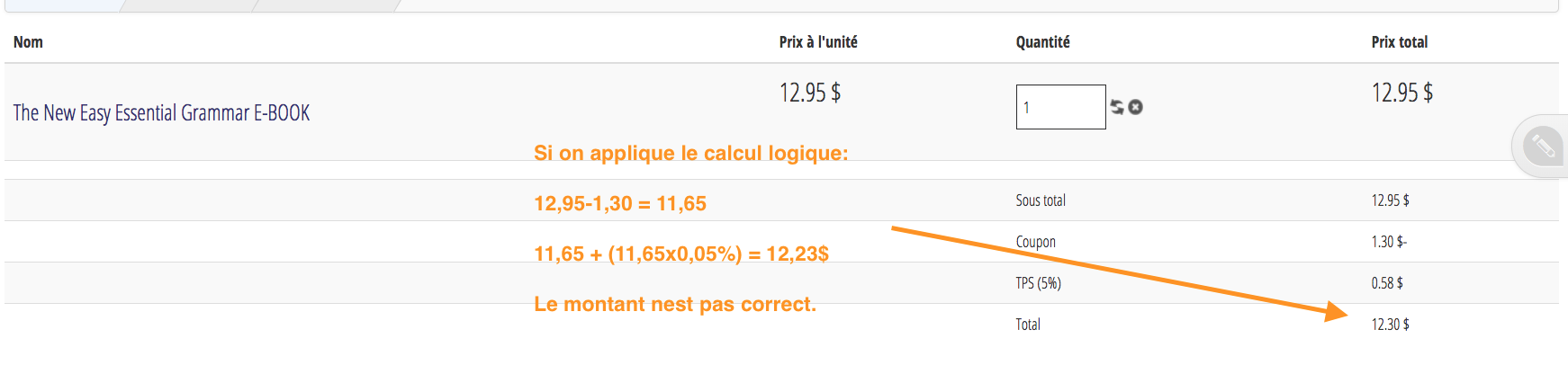 Si j'attribue le coupon à aucune catégorie de taxe, le total de la commande est 0,07$ de trop (voir capture d'écran).