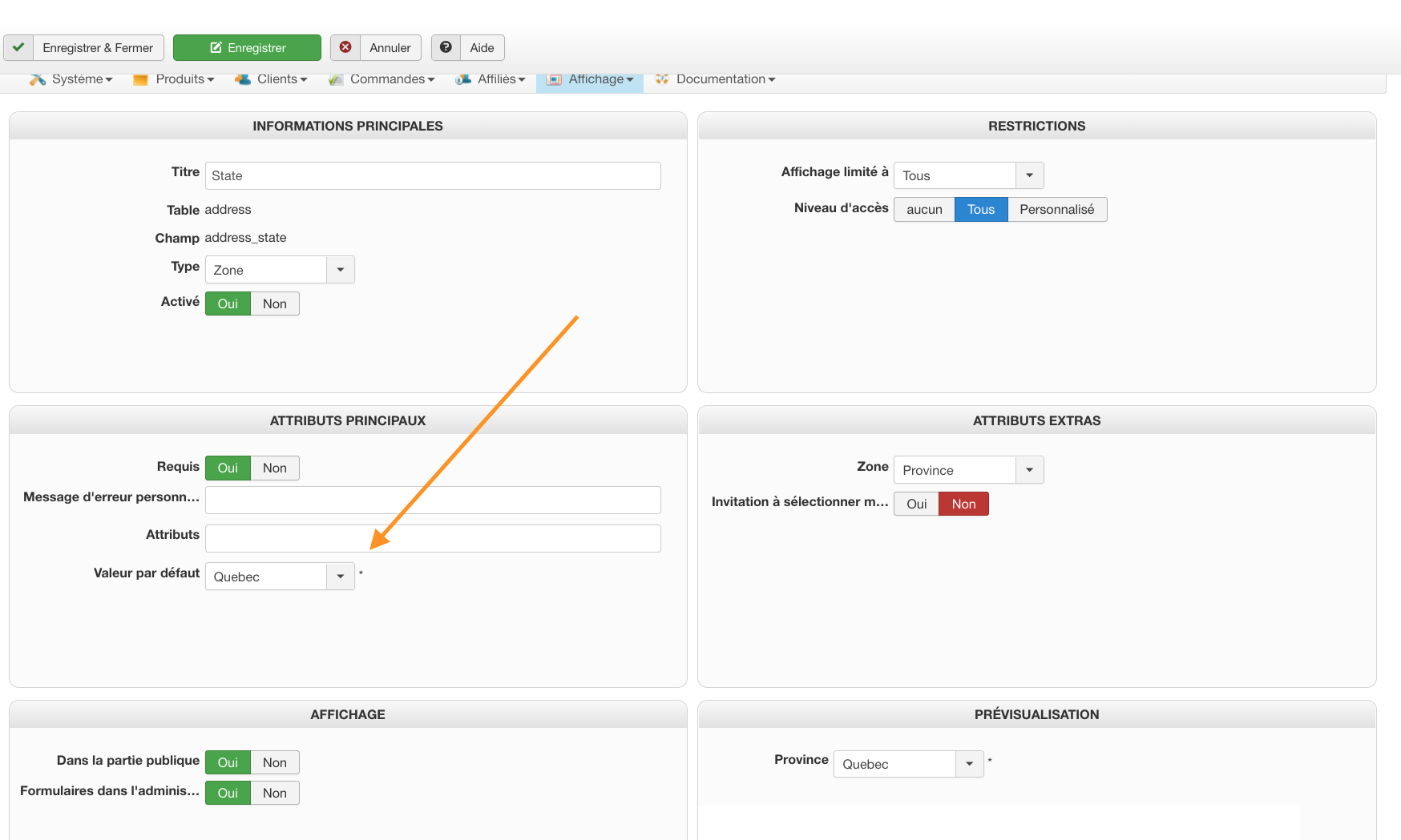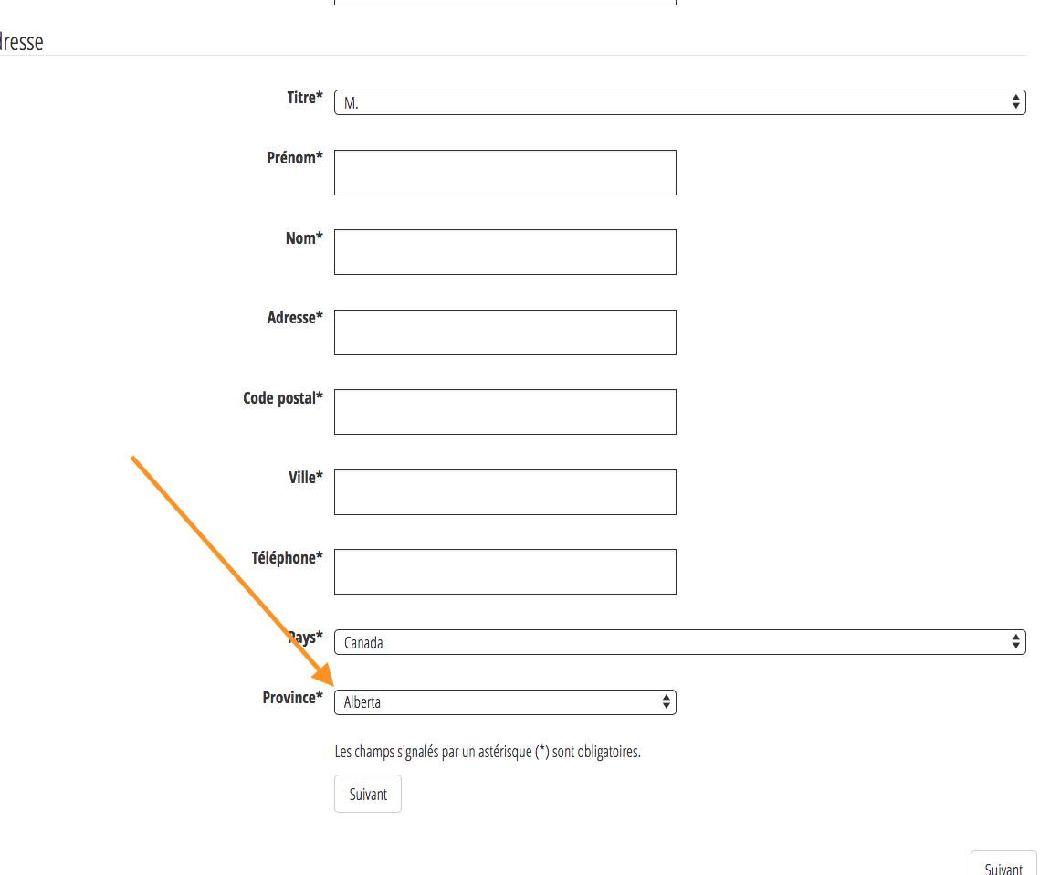 Dans le passage à la caisse, lorsque vient le temps d'entrer l'adresse, j'aimerais faire afficher la province de Québec par défaut. Actuellement, Alberta est affiché par défaut. VOIR ATTACHMENT 1