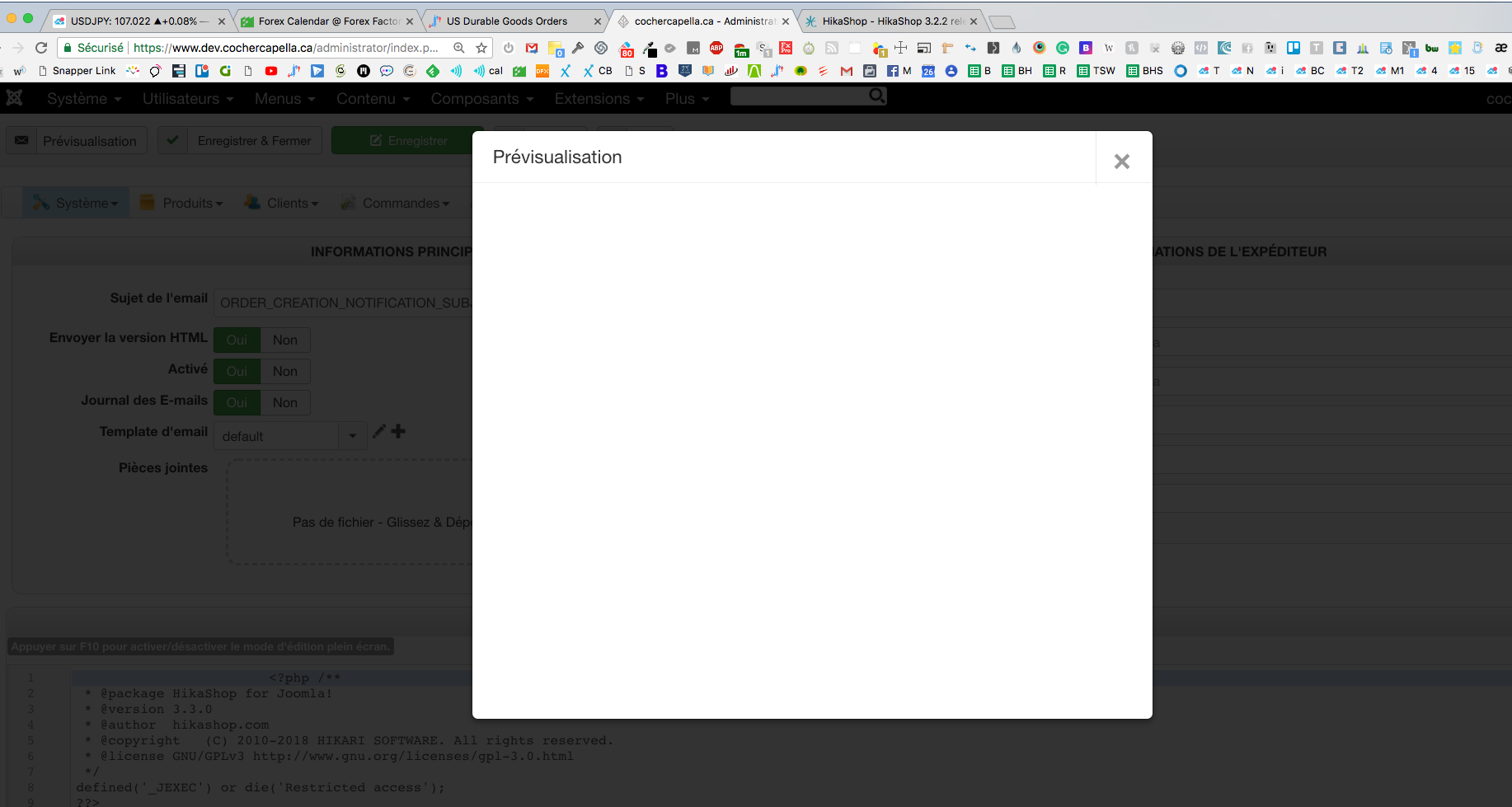 je suis très heureux de l'ajout de la prévisualisation du courriel dans la section email d'hikashop. Cependant j'ai un bogue. Le popup est blanc avec rien dedans. Quel en serait la cause selon vous? Merci,