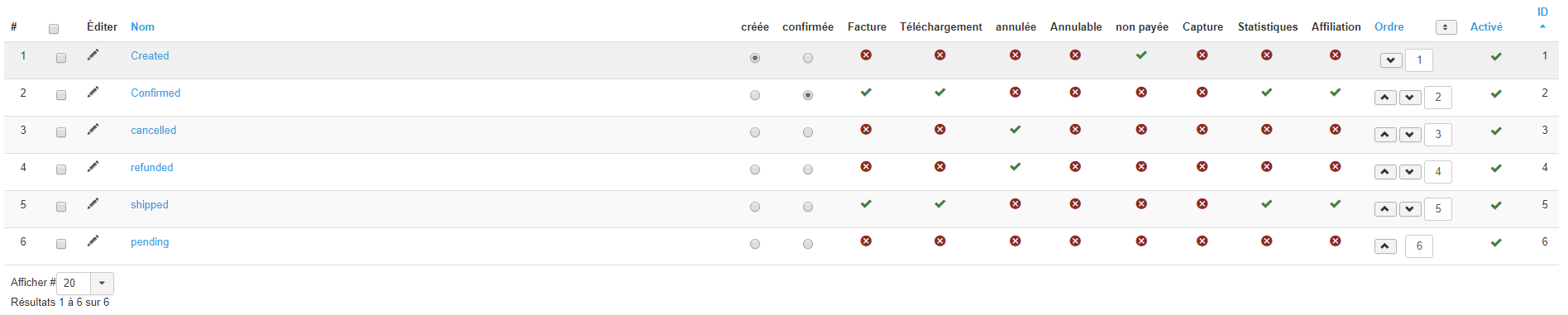 Vérifiez que ce soit "créée" qui soit sélectionné dans la colonne "création". Sinon, si vous avez "confirmée" de sélectionné alors la commande sera déjà confirmée à la création, avant même qu'HikaShop passe la main à la méthode de paiement ( et donc soucis avec n'importe quelle méthode de paiement).
