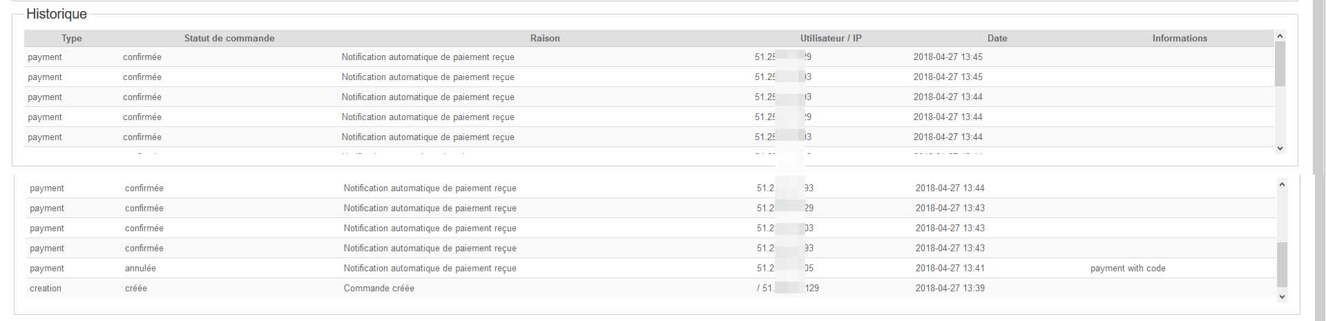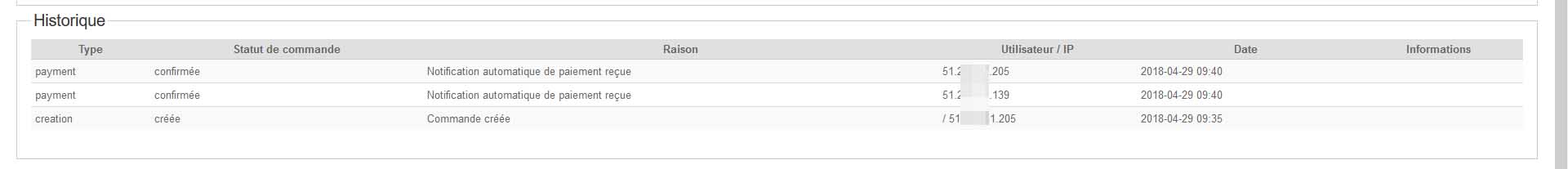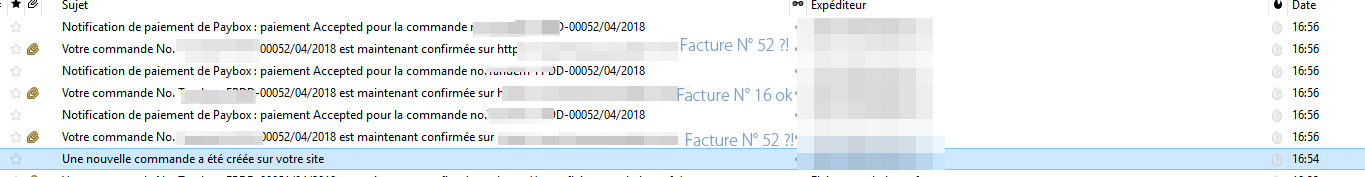 5 /!! Ps : le pb vient à nouveau d'arriver ce dimanche matin : une commande (N°61 ok) avec deux notifications paiement "accepted" (n°61 ok) et deux mails de confirmation de commande au client avec facture jointe en PDF mais une facture à le numéro 00025/04/2018 (normal vu notre config HS [n° commande # n°facture]) et l'autre notification confirmation avec facture 00061/04/2018.