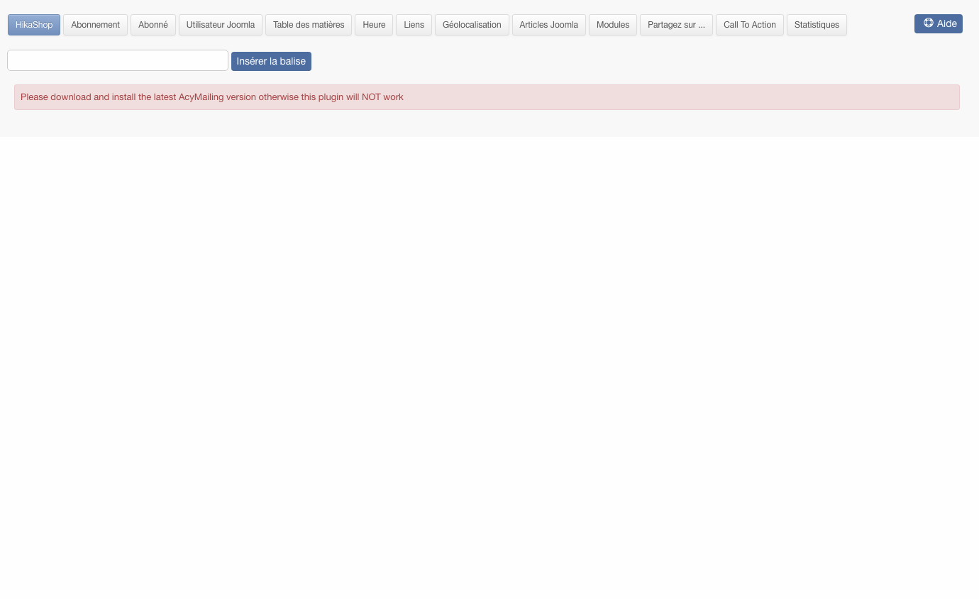 Je n'ai plus la possibilité d'utiliser les balises dans Acymailing pour intégrer des produits Hikashop.