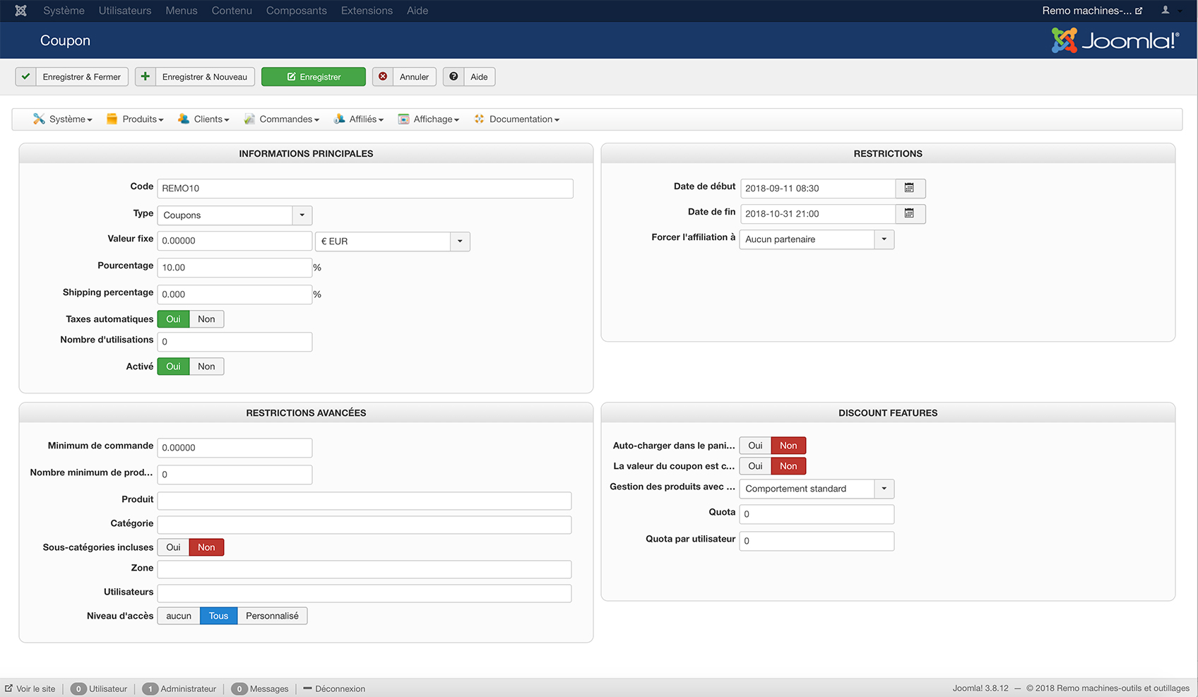J’ai créé un coupon pour que l'utilisateur puisse saisir le code du coupon durant le passage en caisse et bénéficier d'une réduction sur le total de sa commande. Voir capture d’écran.
