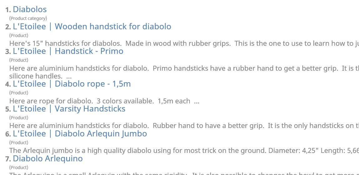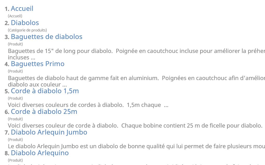 En anglais, au lieu d,afficher le nom du produit, c,est plutôt les mots clés du produits qui apparaisent dans la liste des résultats.