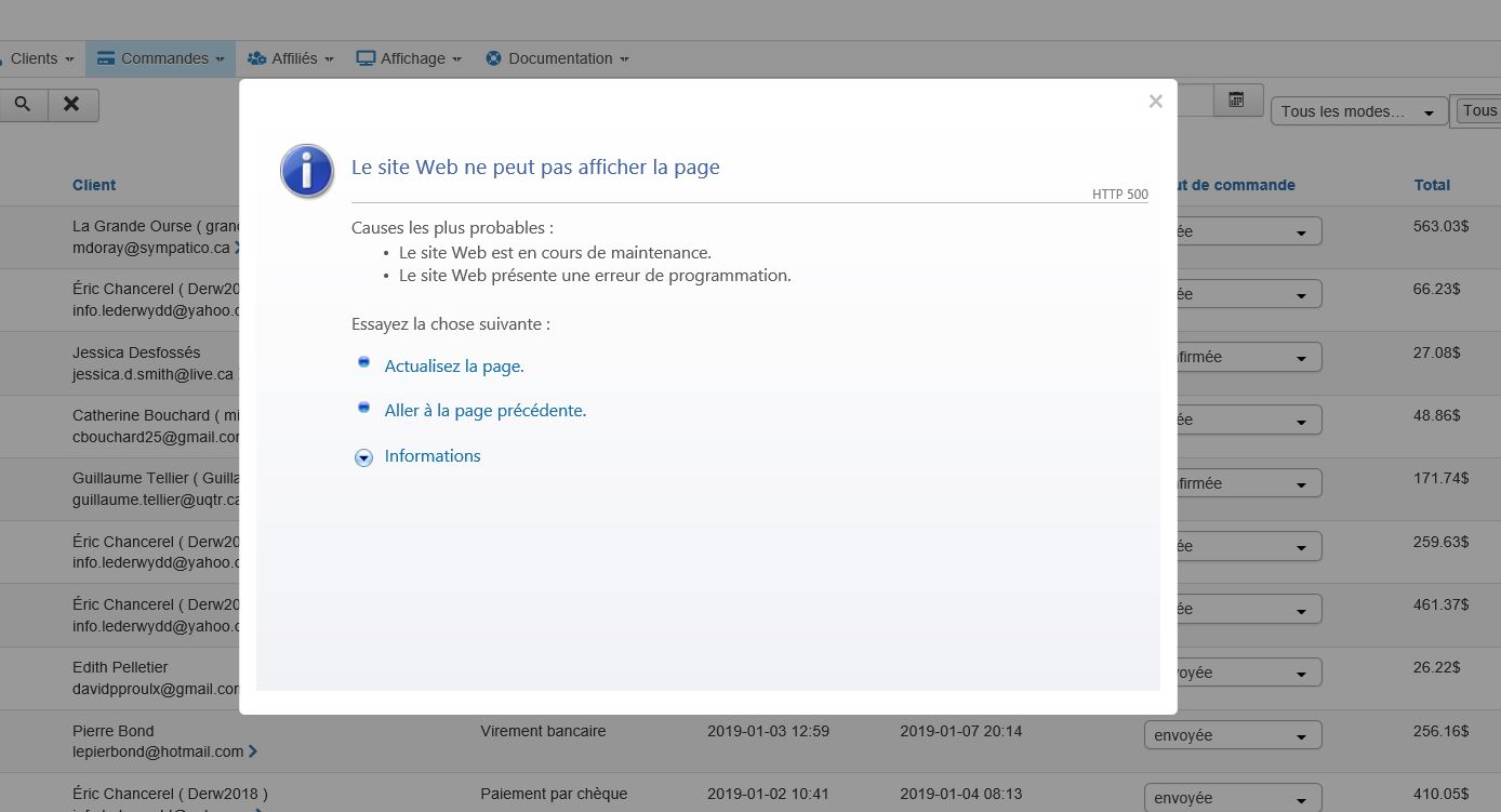 2. C'est surement lié au problème du point 1 car dans cette popup, l'email de notification à l'utilisateur est généré, or il a aussi besoin de générer l'adresse comme pour la facture et du coup une erreur dans le format de l'adresse casserait aussi cette fonction.