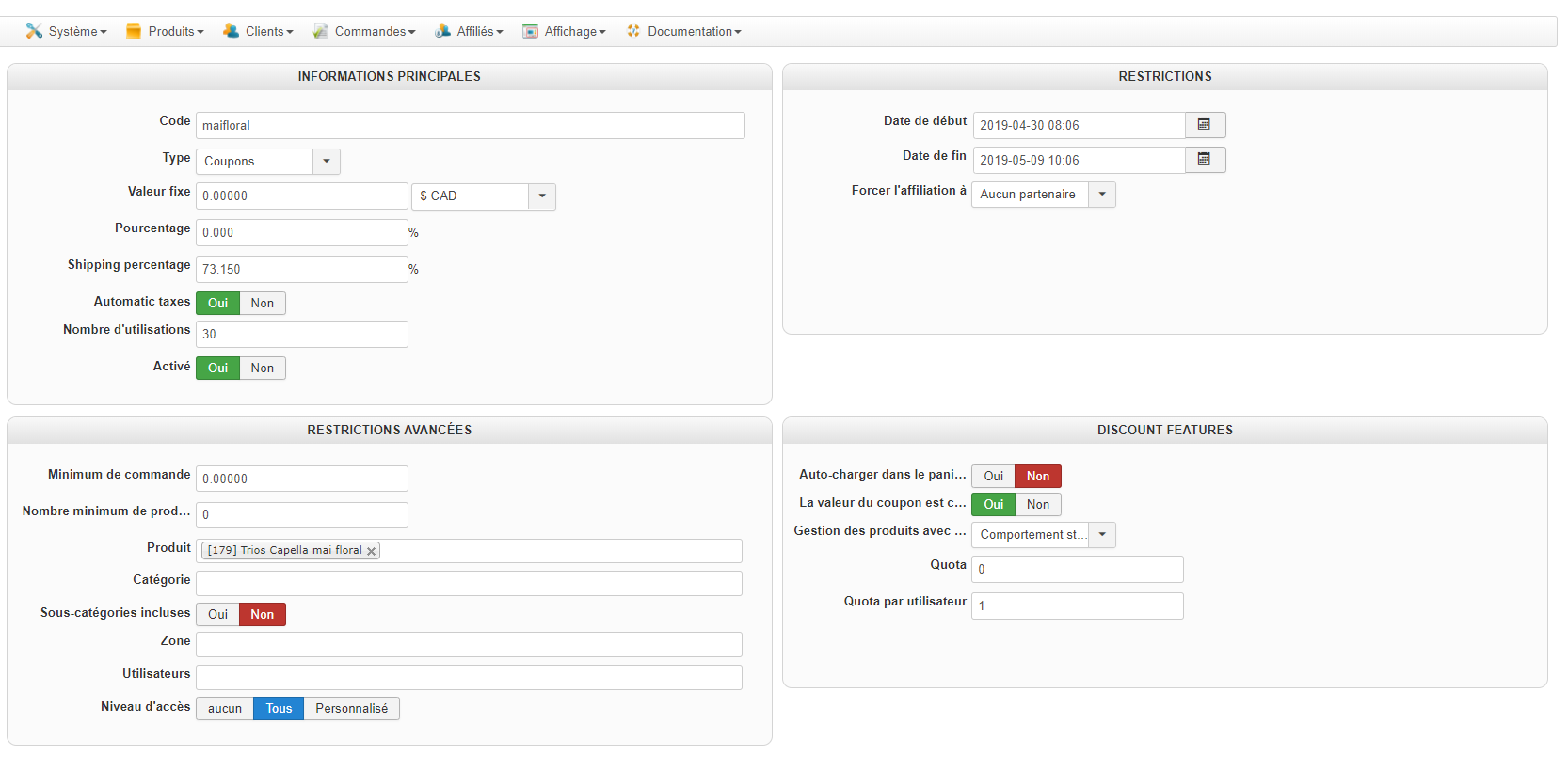 C'est surement quelque chose lié au coupon lui-même. Pourriez-vous fournir une capture d'écran des options de votre coupon ?
