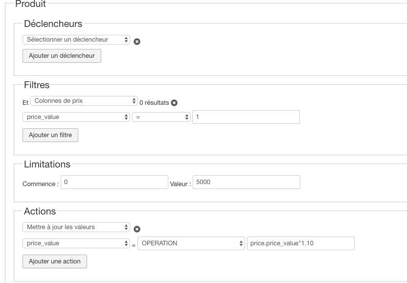 - Dans action : Price Value - OPERATION et price.price_value"1.10 (est-ce correct ?)