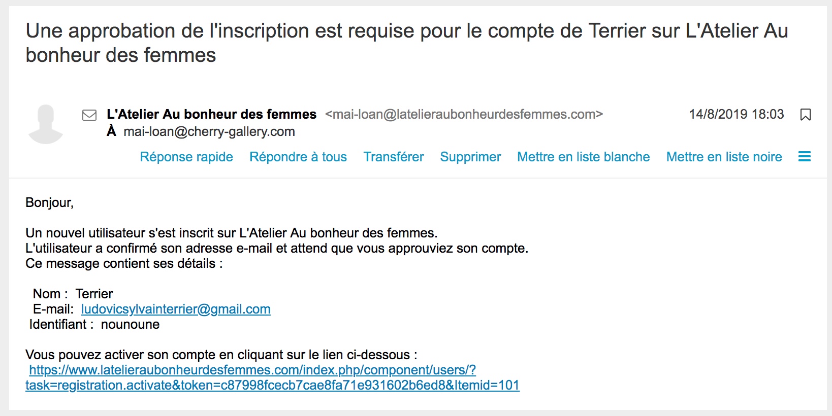 L'email que vous recevez est un email de Joomla et non d'HikaShop ; car vous utilisez le mode demandant à l'administrateur de valider tous les comptes.