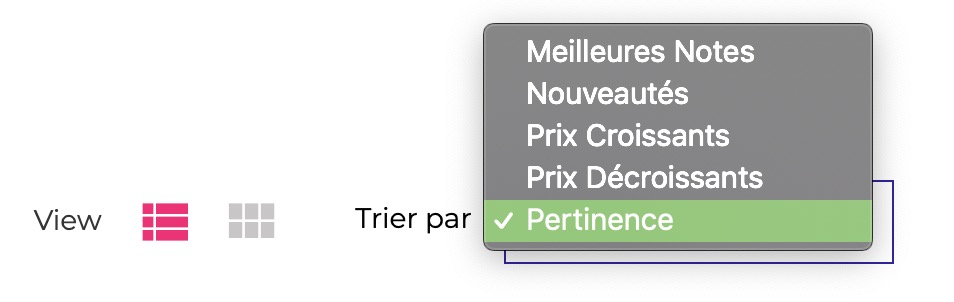 Vous pouvez créer un nouveau filtre via le menu Affichage>Filtres. Sélectionnez le type "dropdown simple" et appliquer le filtre sur le "tri". Ensuite, sélectionnez les colonnes de tri et voilà. Le filtre devrait normalement apparaître en haut de vos listings de produits, à moins que vous ayez l'option d'affichage des filtres désactivée dans l'onglet "products options" de votre élément de menu via le gestionnaire de menus de Joomla.