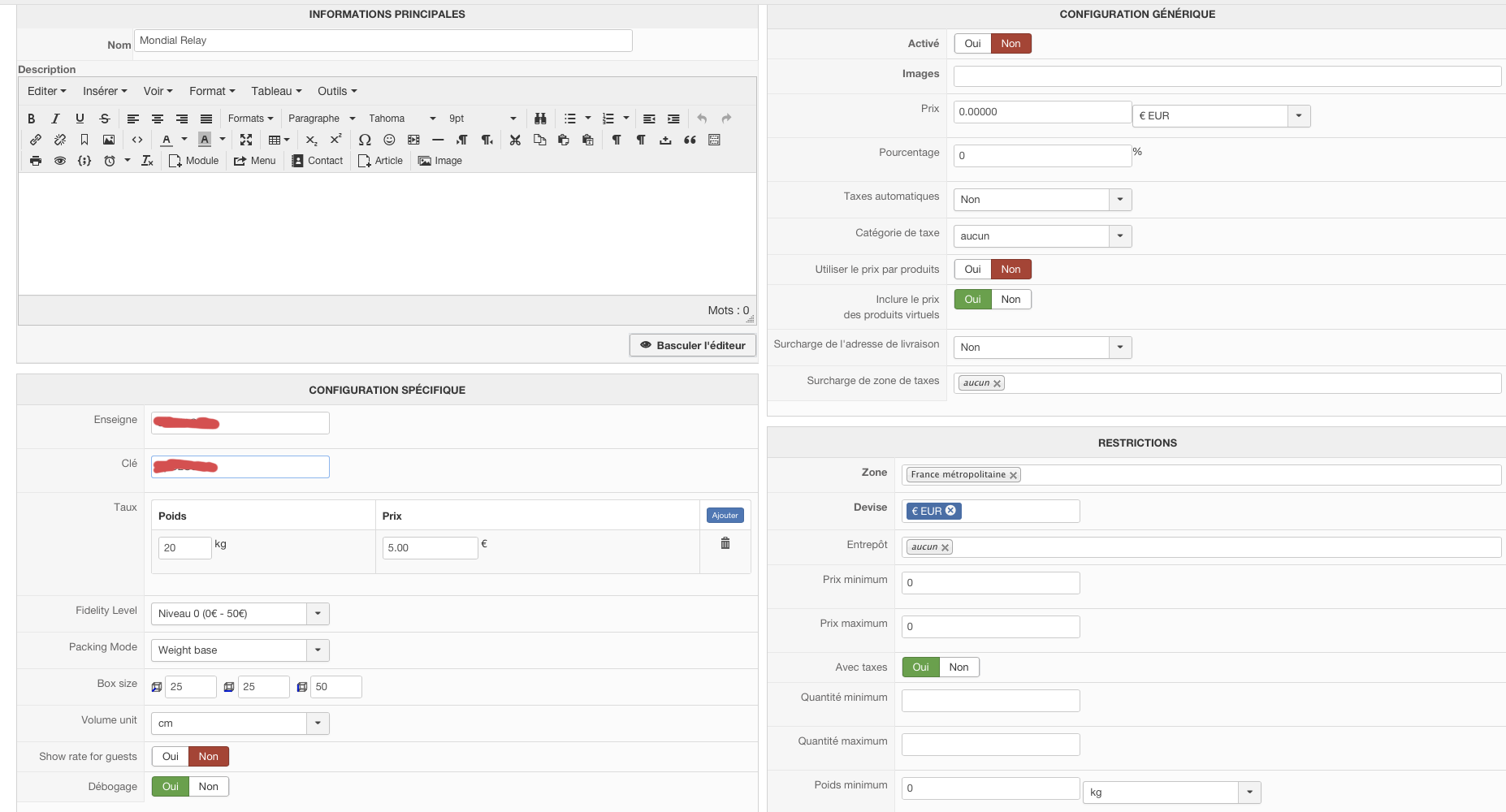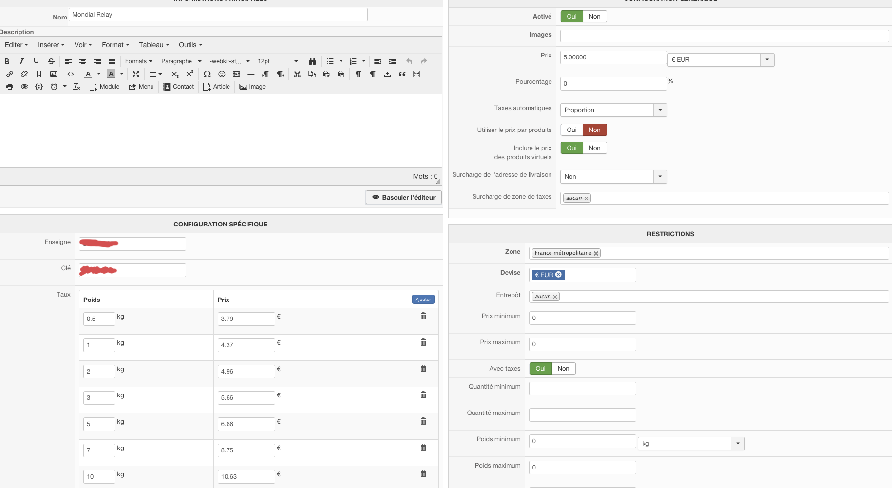Comme vous le voyez dans la capture, le plugin va se baser sur un poids pour donner un prix ; et si le poids est de "0 grammes" alors le produit est considéré comme "immatériel" et donc ne va pas être expédié.