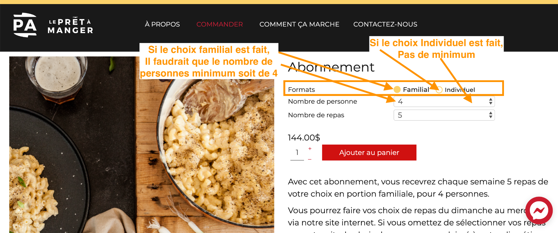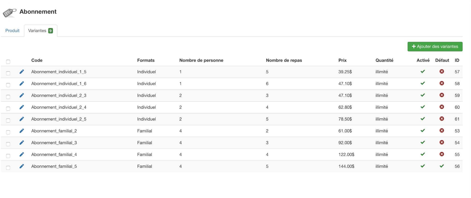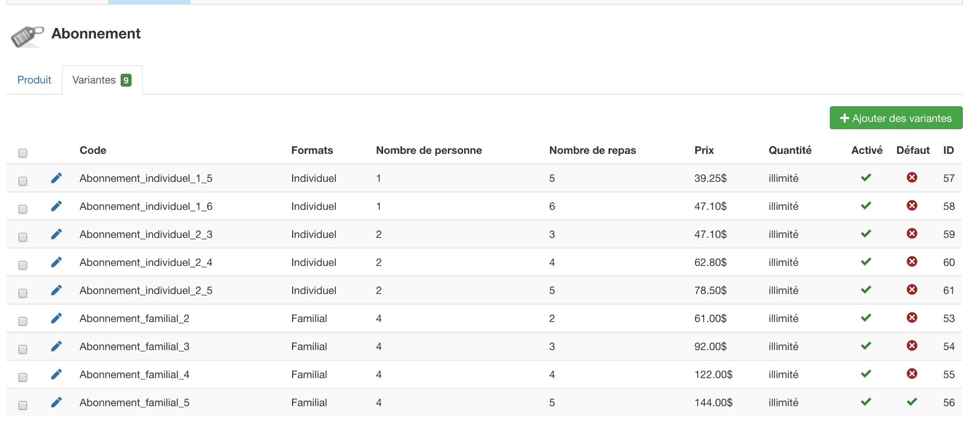 je vous explique mon objectif. Pour un service de traiteur. Nous voulons offrir deux types de plat. Un en format familial de 4 portions et un en format individuel. C'est un abonnement que le clients vont prendre via Hikasubscription, mais c'est au niveau de l'affichage des variante que je me heurt.