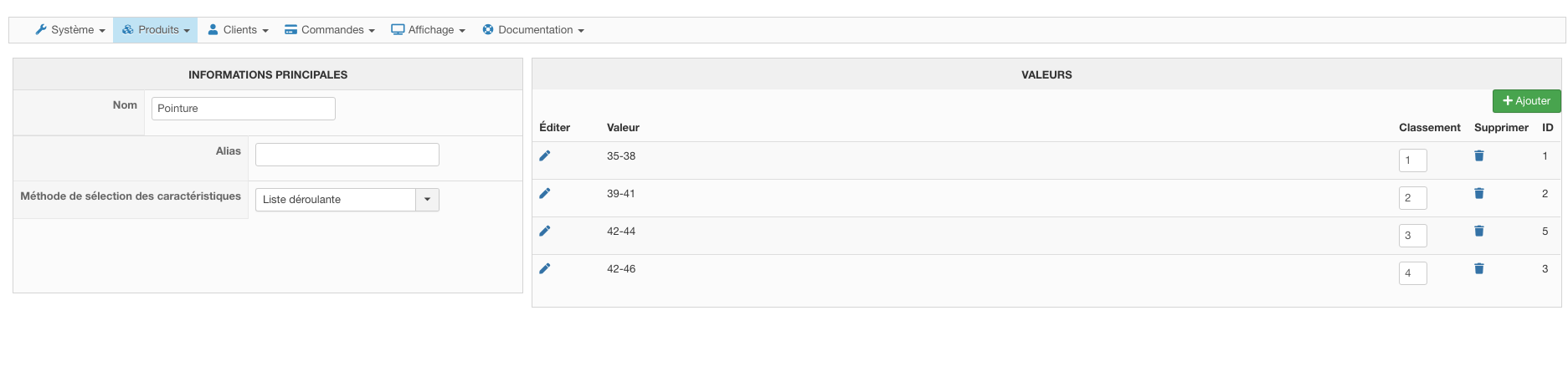 - Création de mes caractéristiques (pointure pour des chaussettes)