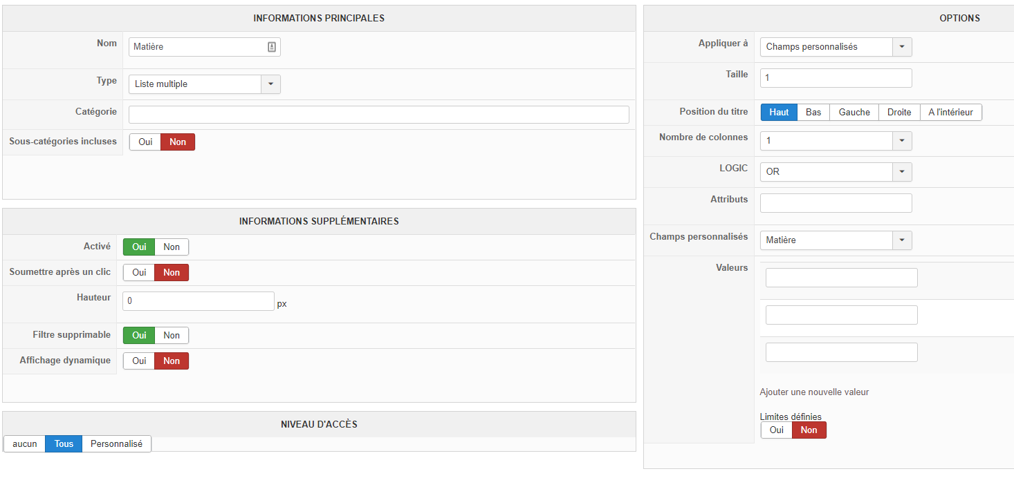 Aussi, je pense que vous voulez désactiver l'option "filtre supprimable" car sinon, une fois une sélection faite, il n'est pas possible de modifier la sélection du filtre, uniquement de la supprimer. Et vous que vous avez l'option "soumission automatique" d'activée, dès le premier choix sélectionné, le système soutmet l'information au serveur, sans vous laisser la possibilité d'en sélectionner un second.