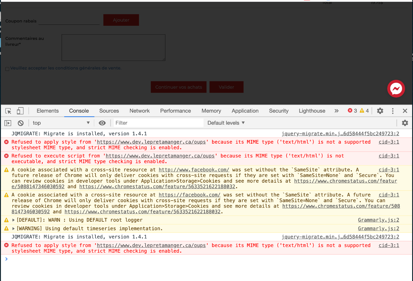 Voici la capture d'écran avec les messages de la console.