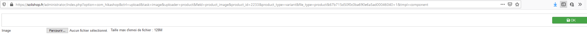 - Après l'avoir uploadé ou sélectionné la photo, on arrive sur une page blanche. Si on fait page précédente 2 fois on revient sur la fiche produit, mais il est impossible de supprimer la photo, en cliquant sur la croix de la photo rien ne se passe. J'ai regardé dans la table hikashop_file, le champ file_name n'est pas rempli pour les photos sélectionnées