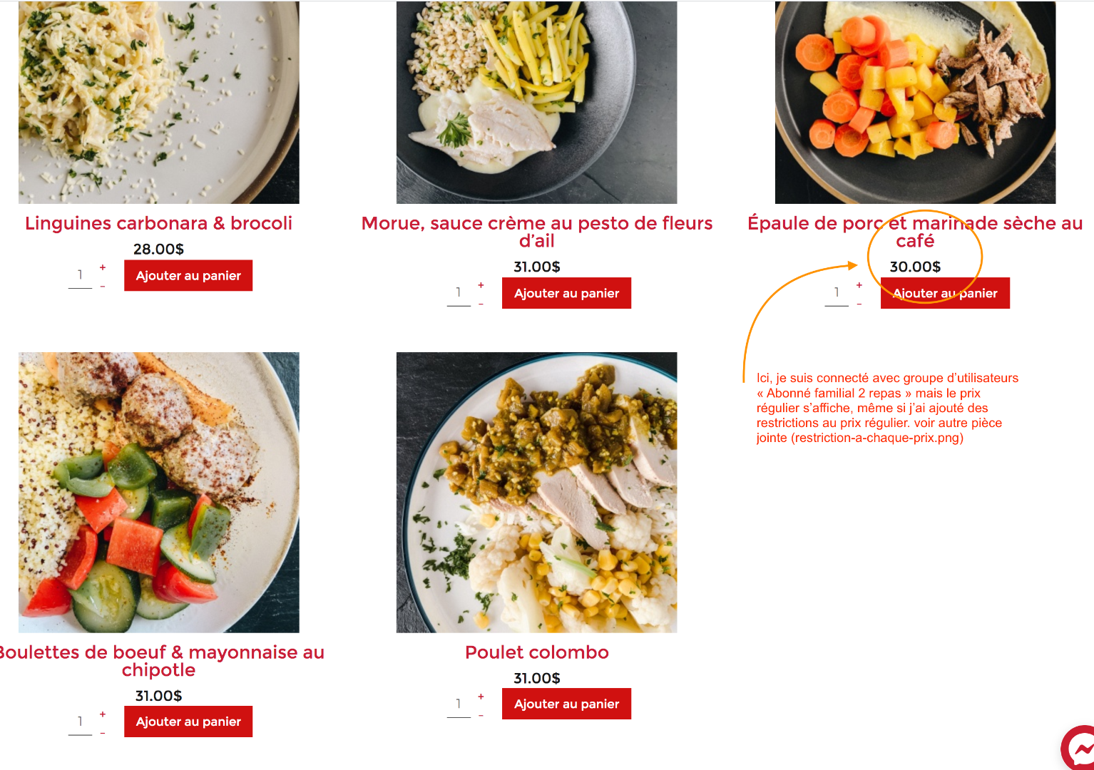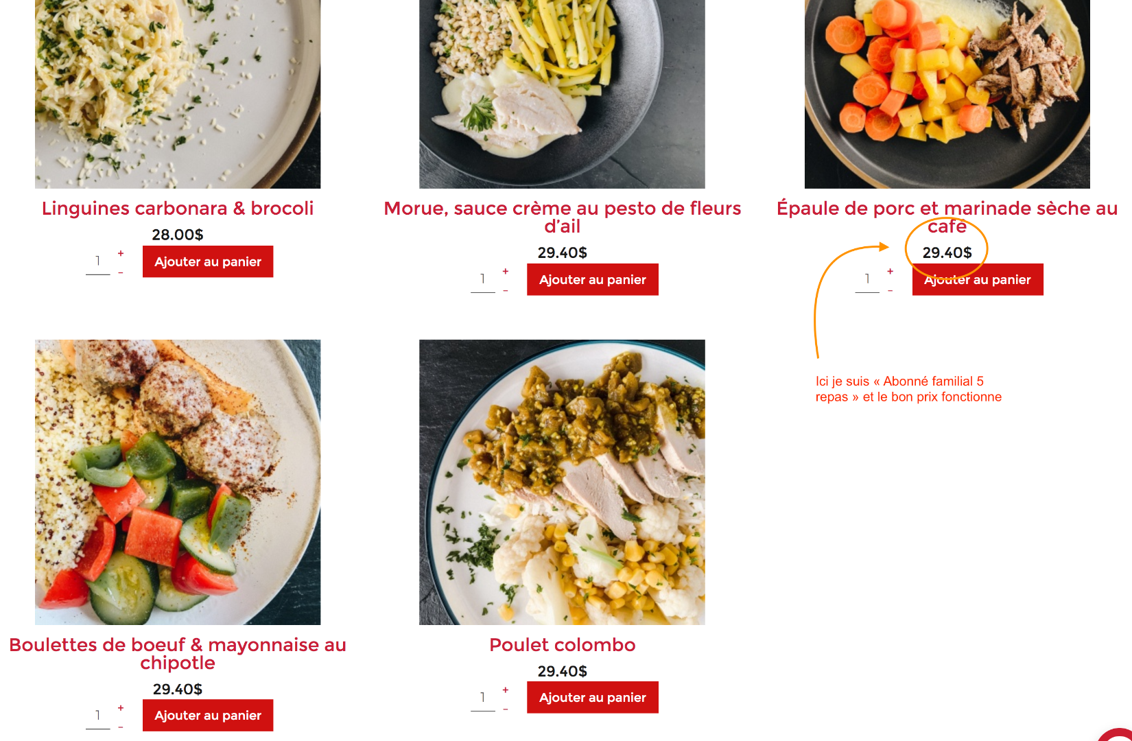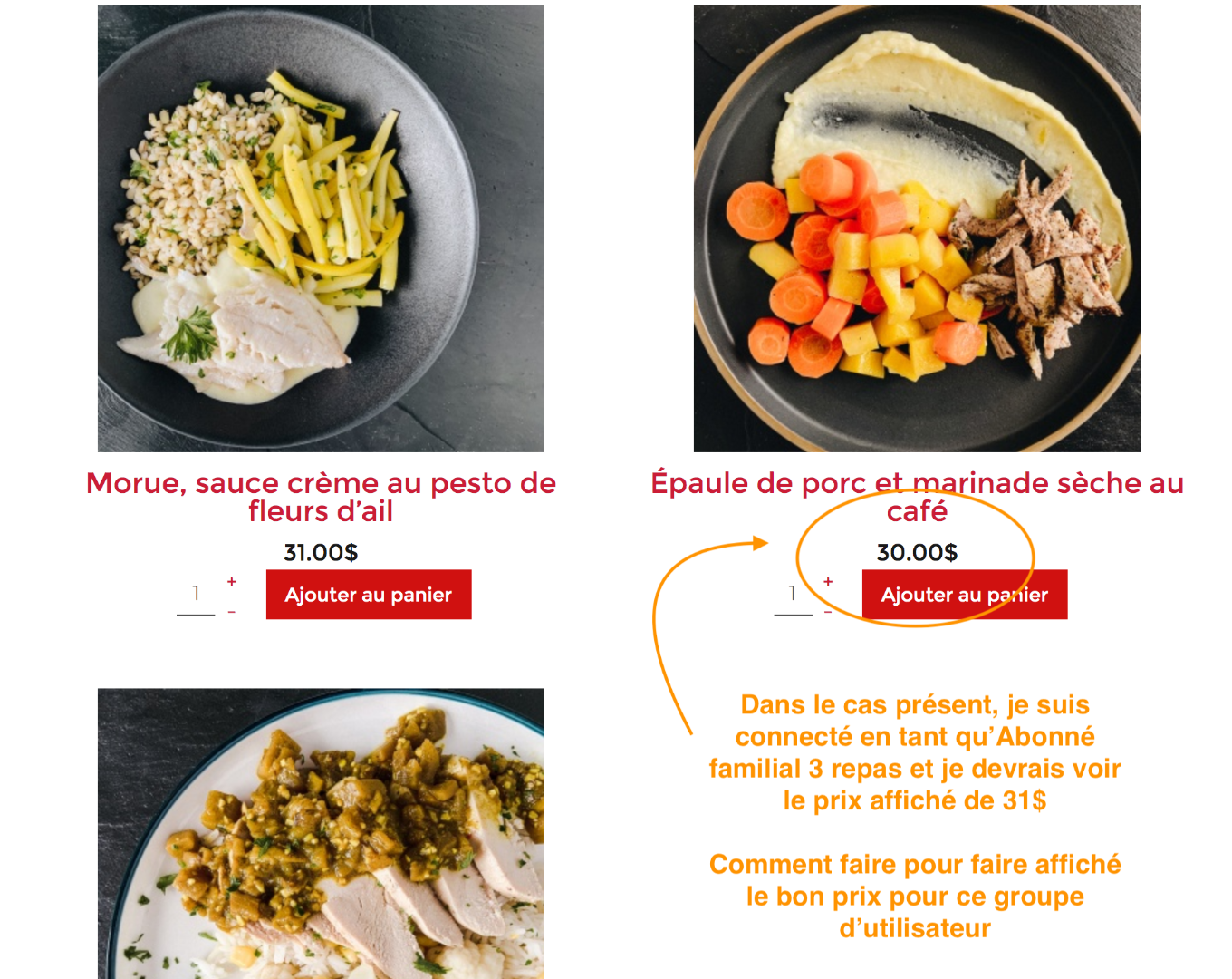 Quels réglages nous devons mettre pour que les clients régulier (visiteurs) voient le prix de 30$, Alors que les clients "Abonné familial 2 repas" "Abonné familial 3 repas" "Abonné familial 4 repas" voient le 31$ et que les "Abonné familial 5 repas" continuent de voir leur prix à 29,40$ ?