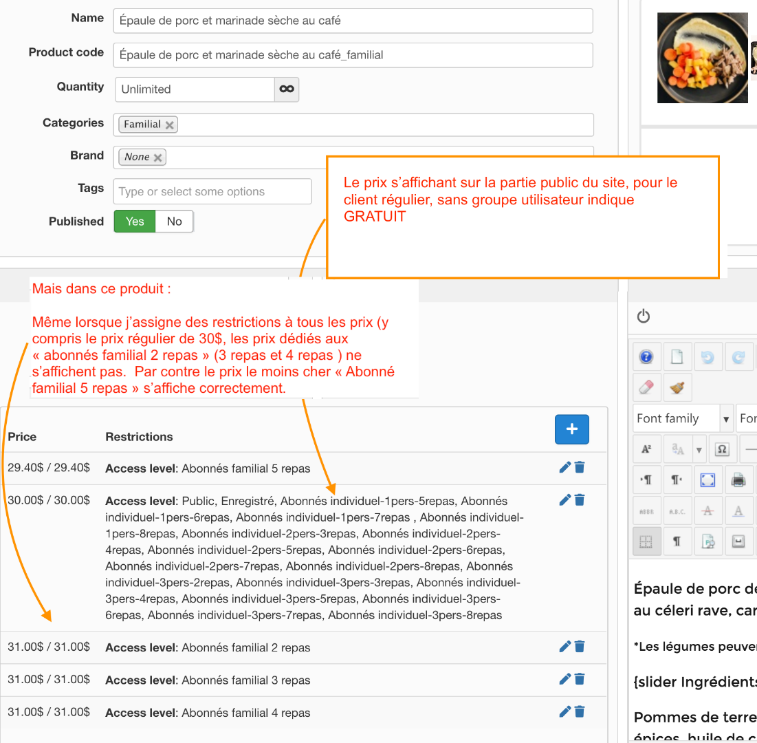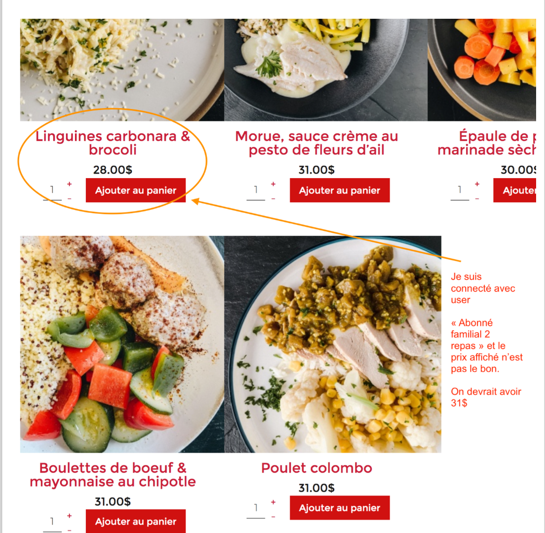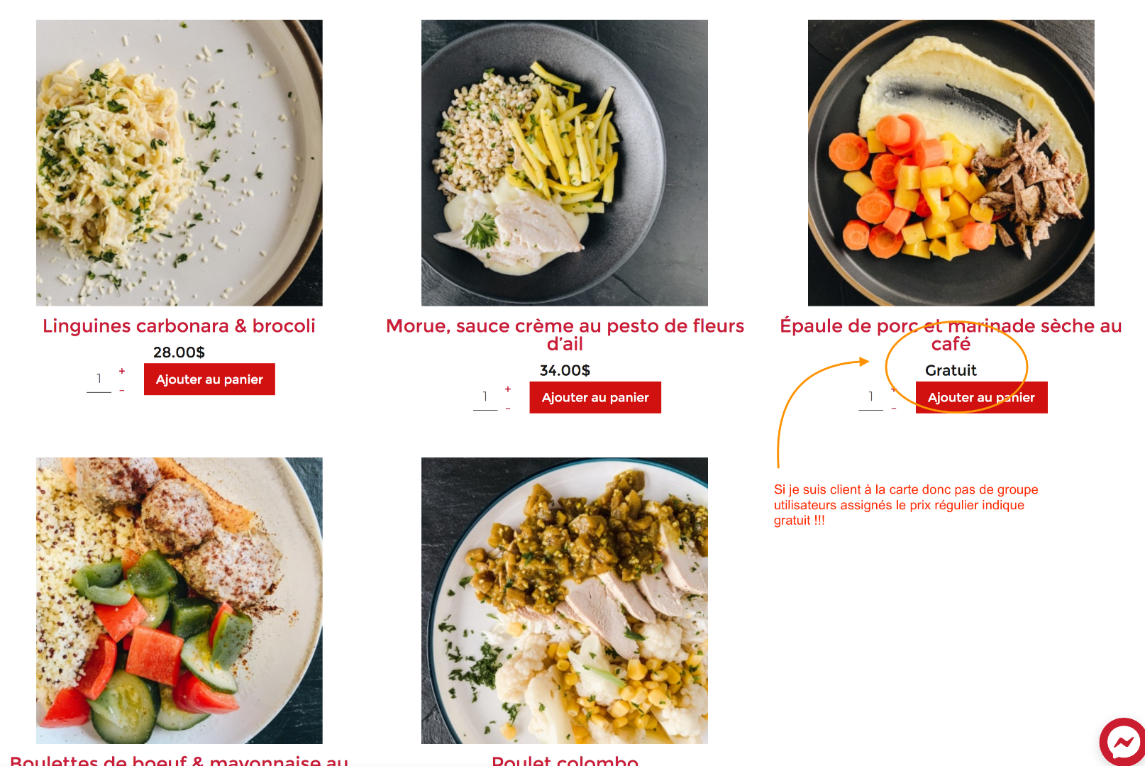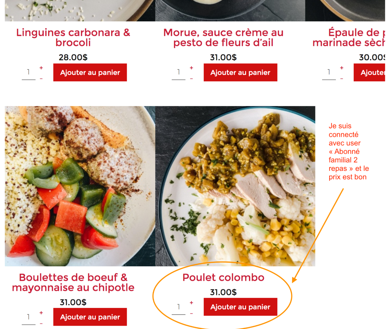 Quels réglages nous devons mettre pour que les clients régulier (visiteurs) voient le prix de 30$, Alors que les clients "Abonné familial 2 repas" "Abonné familial 3 repas" "Abonné familial 4 repas" voient le 31$ et que les "Abonné familial 5 repas" continuent de voir leur prix à 29,40$ ?