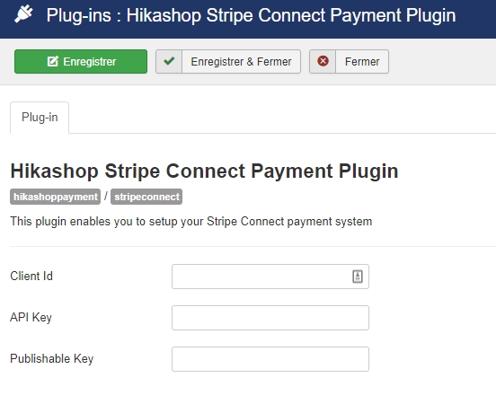 Dans votre capture "plugin hikashop stripe connect payment" (soit la configuration du plugin côté Joomla), vous devez renseigné les 3 champs.