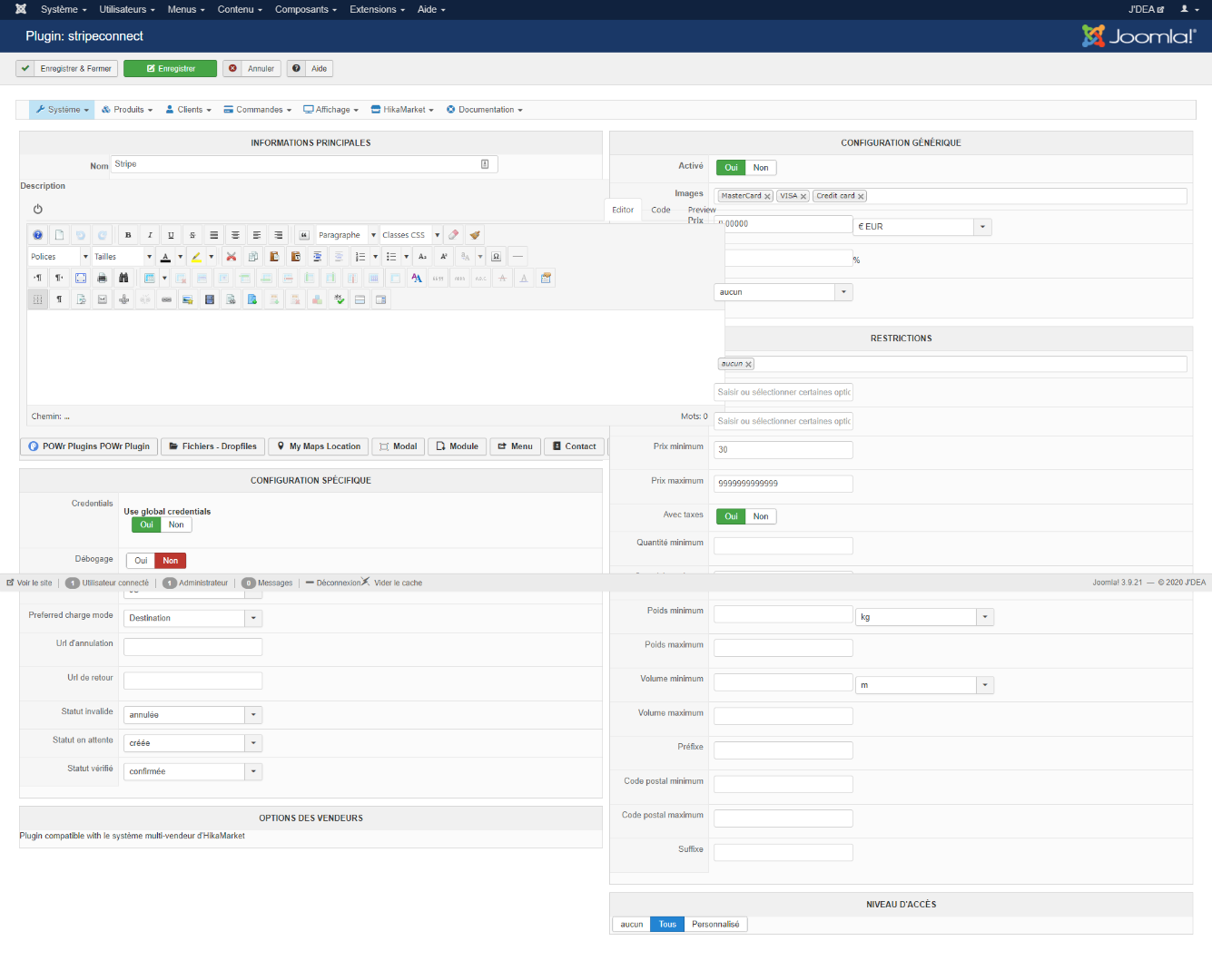 3- Vous indiquez "La connection se fait via la page d'édition du vendeur (et le plugin "hikamarket / stripeconnect")." Or je ne vois aucun paramètre au sein de la page du vendeur relatif à Stripe. Le plugin "HikaMarket - StripeConnect integration" est bien activé.
