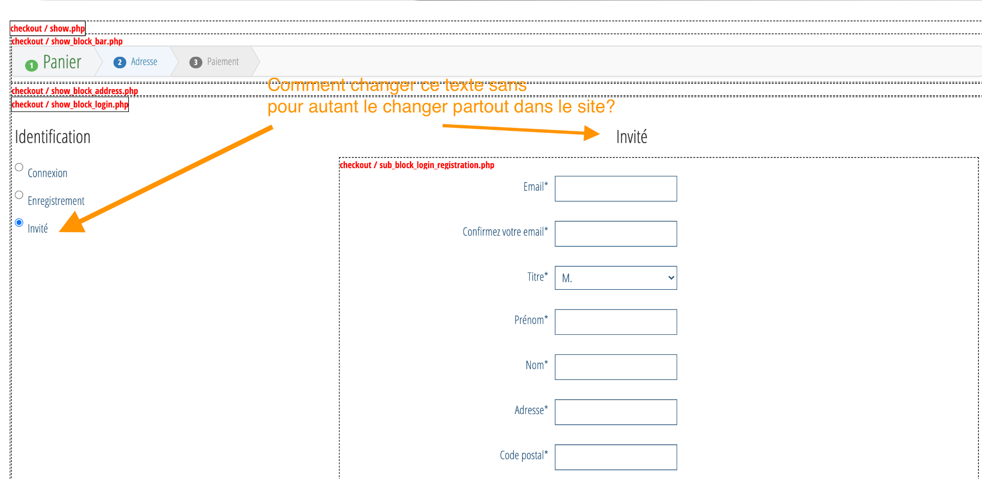 je voudrais changer le mot "Invité" dans la page de Checkout pour "Invité - Achetez directement sans compte". Je veux par contre m'assurer qu'en changeant le mot dans le fichier langue, ce ne sera pas effectif partout.