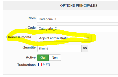 Pour ça, je suis allé dans Hikashop / produit / variantes. Là, j'ai modifié chaque variante en changeant le Nom, le Code produit et le Tarif mais je n'arrive pas à changer les noms dans la rubrique "choisir le montant" (menu déroulant qui est juste en dessous de code).