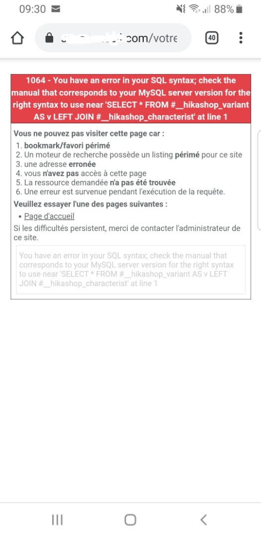 Je viens d'avoir un retour de client qui ne parvient pas à télécharger le dossier acheté il obtient l'erreur suivant : 1064 - You have an error in your SQL syntax; check the manual that corresponds to your MySQL server version for the right syntax to use near 'SELECT*FROM #__hikashop_variant AS v LEFT JOIN #__hikashop_characterist' at line 1"
