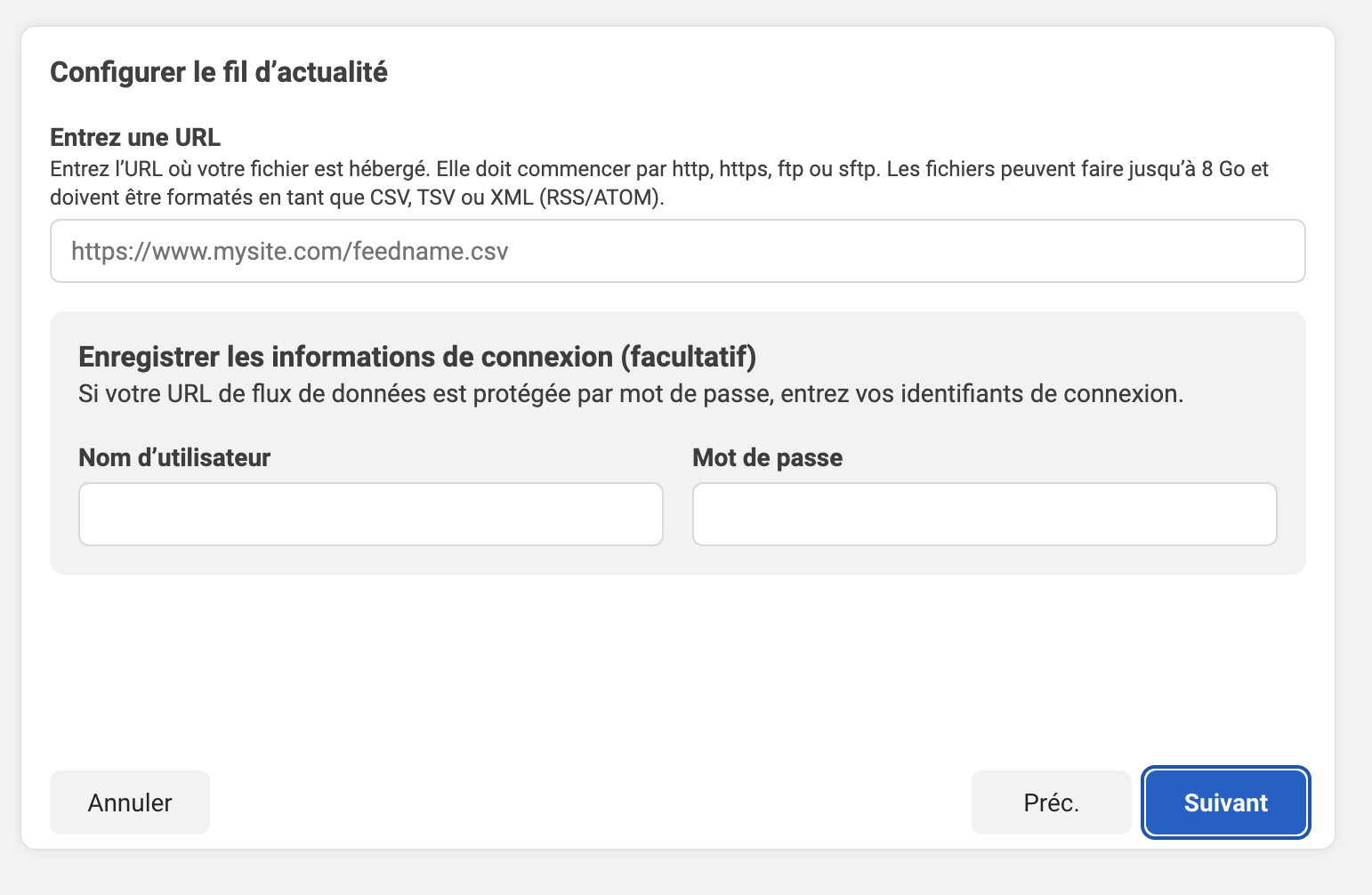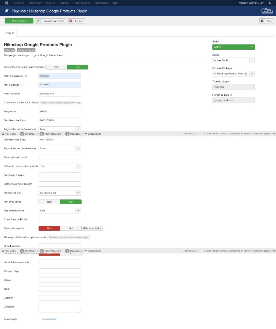 Les champs "Nom d'utilisateur FTP" et "Mot de passe FTP" sont pour la connection à Google, donc vous voulez laisser ces champs vides.